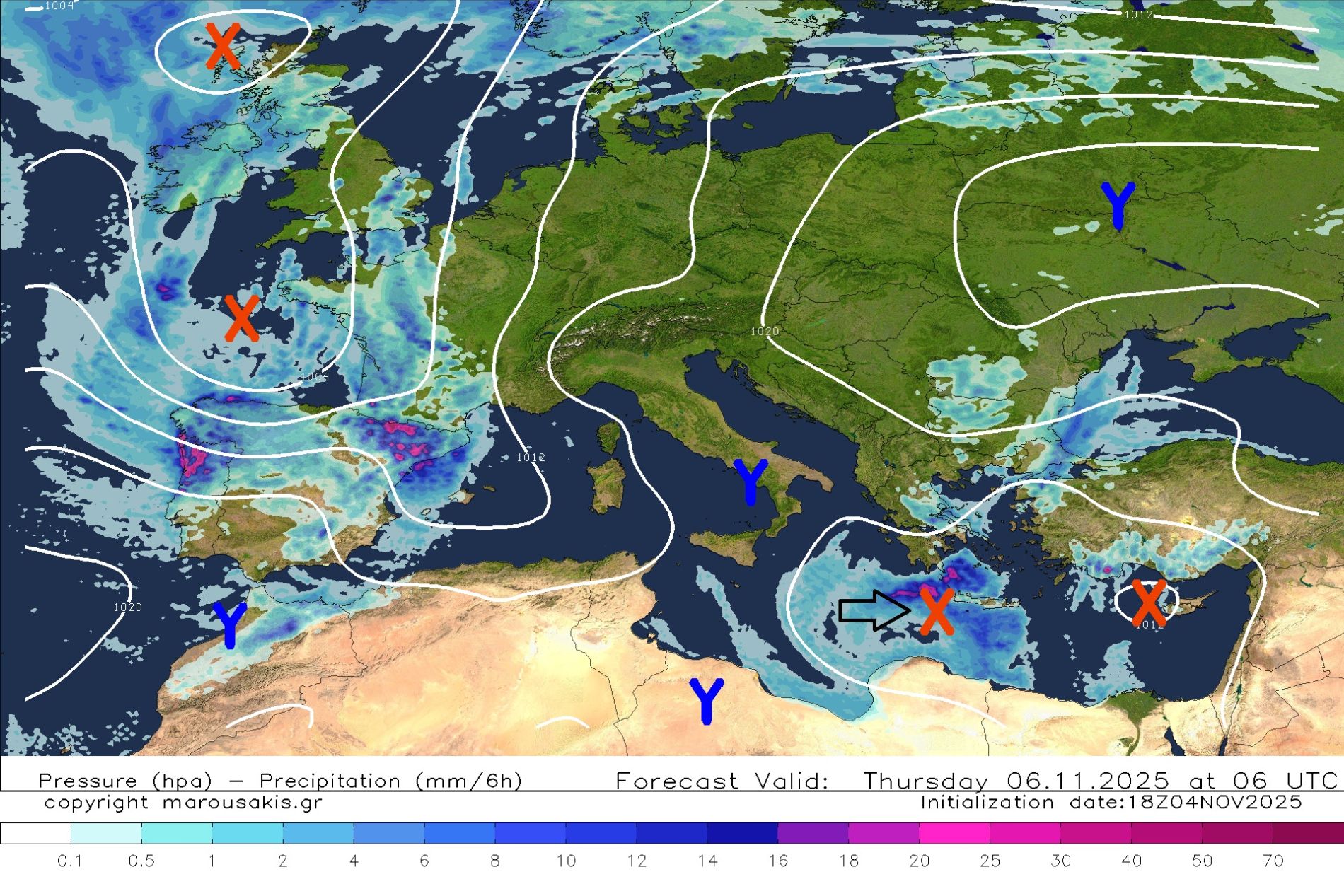 Ο ίδιος κάνει λόγο για τον δεύτερο χάρτη που έχει αναρτήσει, σημειώνοντας πως με το μαύρο βέλος προς τη βορειοανατολική Ευρώπη υψώνεται ένα ατμοσφαιρικό βουνό. «Αυτό θα έχει ως αποτέλεσμα το βαρομετρικό χαμηλό που σημειώνουμε στον ίδιο χάρτη με το λευκό βέλος, να δυσκολευτεί να βρει διέξοδο ανατολικότερα. Αυτό σημαίνει ότι θα κινηθεί αργά στοβιλιζόμενο στην αυτή έκταση και άρα θα δώσει μεγάλο όγκο νερού σε πρώτη φάση στα δυτικά και σε δεύτερο χρόνο προς τα βόρεια βορειοανατολικά αλλά και το ανατολικό νοτιοανατολικό Αιγαίο κάτι που σημειώνουμε στον τελευταίο μας χάρτη», επισημαίνει και καταλήγει: