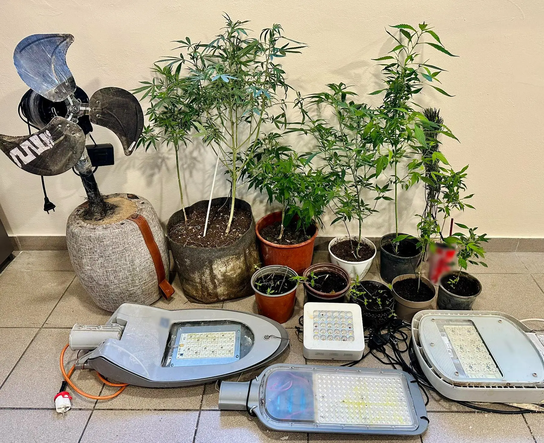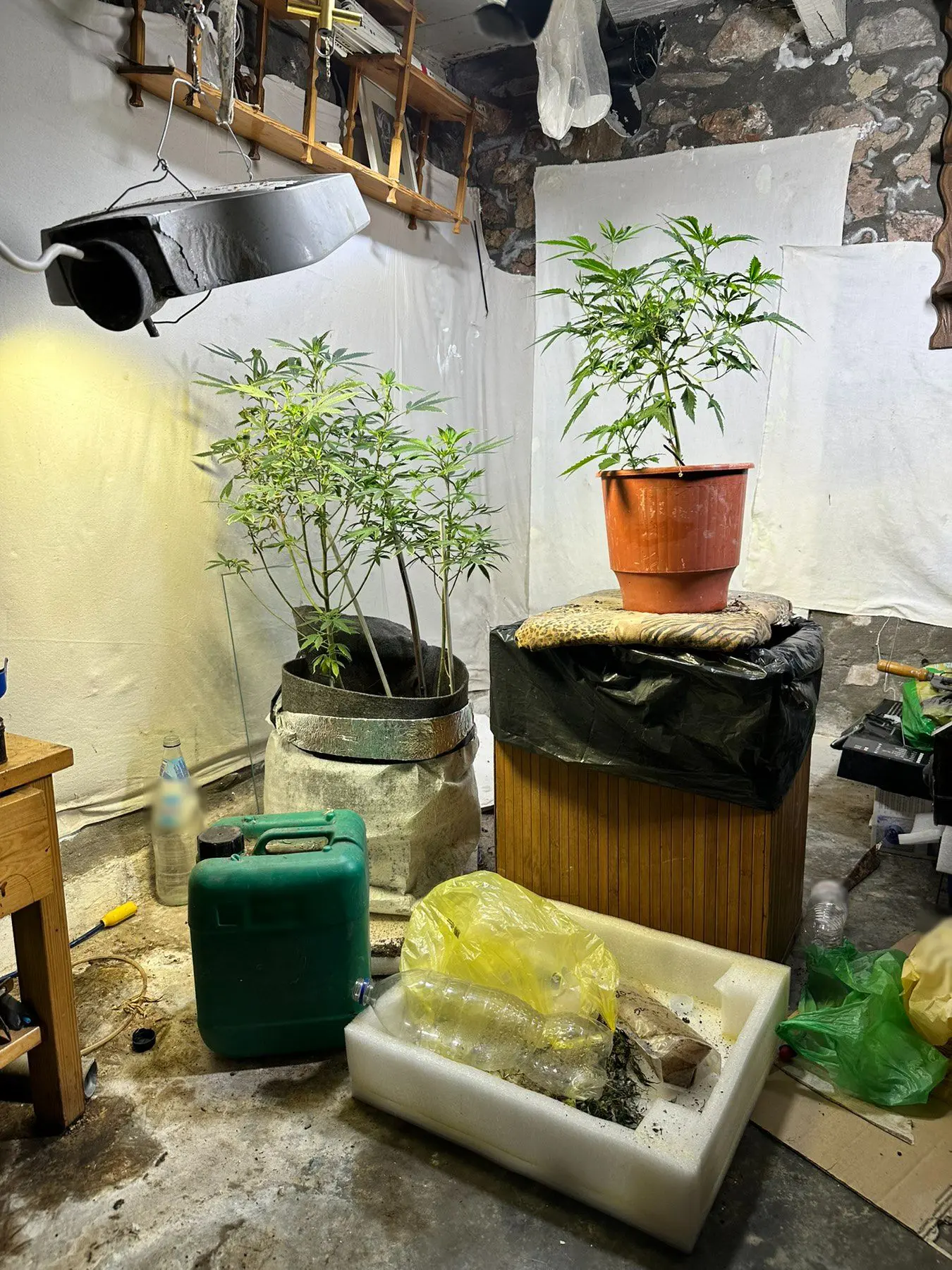Εξοπλισμός, για δύο υδροπονικές καλλιέργειες κάνναβης ( λαμπτήρες παραγωγής τεχνητού φωτός και ανεμιστήρας), 11 δενδρύλλια κάνναβης (τύπου skunk), ύψους από 0,2 μ. έως 0,95 μ., δενδρύλλιο κάνναβης σε στάδιο αποξήρανσης, ύψους 0.65 μ., 34 φυτά κάνναβης, 237 γραμμάρια ακατέργαστης κάνναβης (χασίς), 13 γραμμάρια κοκαΐνης, κρυμμένα σε ξύλινη κούκλα, 10 γραμμάρια ηρωίνης, σπόροι κάνναβης, 12 γραμμάρια φυτικών αποσπασμάτων κάνναβης, ηλεκτρονική ζυγαριά ακριβείας, μεταλλική πτυσσόμενη ράβδος (γκλοπ), 4 ξιφίδια, 2 μαχαίρια, αεροβόλο πιστόλι, 4 φυσίγγια, ηλεκτρονική συσκευή αεροστεγούς σφράγισης πλαστικών συσκευασιών και κάμερες κλειστού κυκλώματος καταγραφής χώρων.