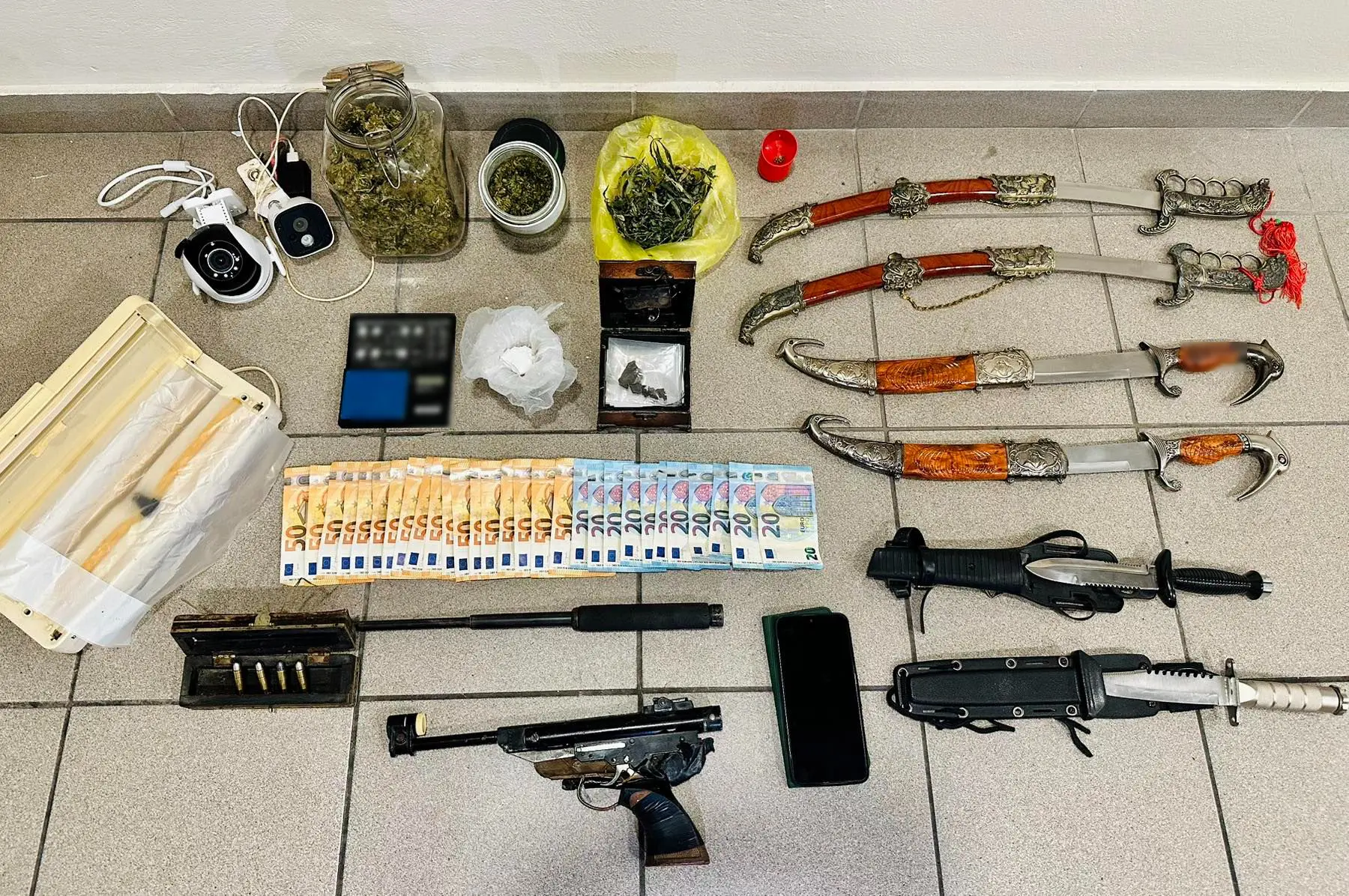 Εξοπλισμός, για δύο υδροπονικές καλλιέργειες κάνναβης ( λαμπτήρες παραγωγής τεχνητού φωτός και ανεμιστήρας), 11 δενδρύλλια κάνναβης (τύπου skunk), ύψους από 0,2 μ. έως 0,95 μ., δενδρύλλιο κάνναβης σε στάδιο αποξήρανσης, ύψους 0.65 μ., 34 φυτά κάνναβης, 237 γραμμάρια ακατέργαστης κάνναβης (χασίς), 13 γραμμάρια κοκαΐνης, κρυμμένα σε ξύλινη κούκλα, 10 γραμμάρια ηρωίνης, σπόροι κάνναβης, 12 γραμμάρια φυτικών αποσπασμάτων κάνναβης, ηλεκτρονική ζυγαριά ακριβείας, μεταλλική πτυσσόμενη ράβδος (γκλοπ), 4 ξιφίδια, 2 μαχαίρια, αεροβόλο πιστόλι, 4 φυσίγγια, ηλεκτρονική συσκευή αεροστεγούς σφράγισης πλαστικών συσκευασιών και κάμερες κλειστού κυκλώματος καταγραφής χώρων.
