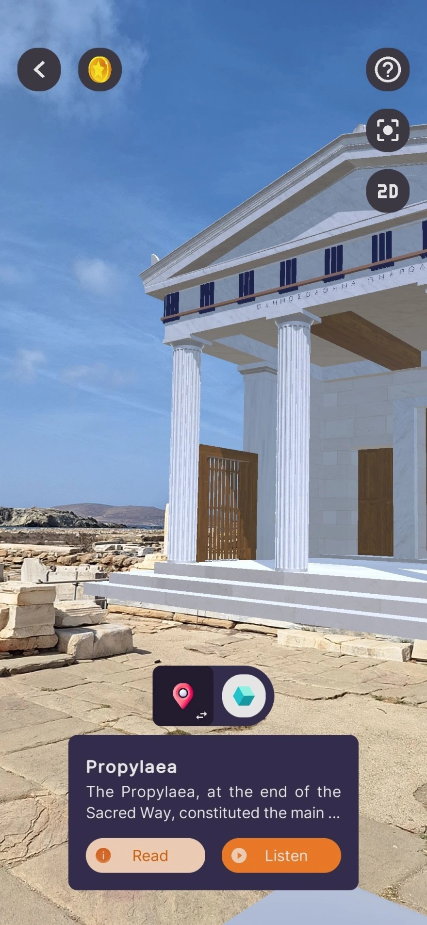 Με ένα απλό smartphone ή tablet, οι χρήστες της εφαρμογής μπορούν βιώσουν μια επαυξημένη εμπειρία: να «ζωντανέψουν» τα μνημεία της Δήλου, να τα δουν τρισδιάστατα, να τα περιστρέψουν, να περιηγηθούν γύρω τους και να απολαύσουν μια εντελώς νέα, βιωματική εμπειρία επίσκεψης. Ο Ναός του Απόλλωνα, η Στοά και ο Οίκος των Ναξίων, τα Προπύλαια, τα Ανδρεία των Λεόντων, όλα αυτά που σήμερα διακρίνονται από τα αρχιτεκτονικά κατάλοιπά τους, αναβιώνουν με τη βοήθεια της επαυξημένης πραγματικότητας και την αξιοποίηση επιστημονικά τεκμηριωμένου περιεχομένου.