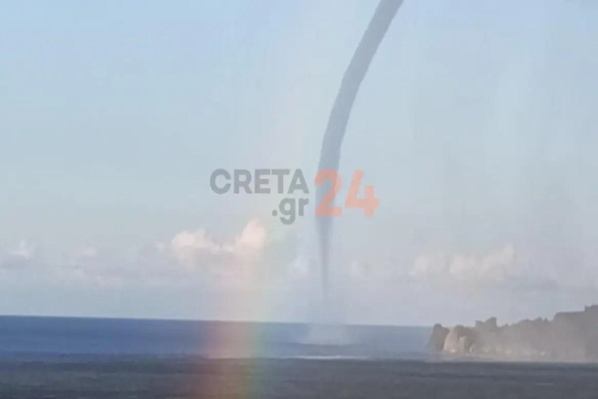 Μια σπάνια εικόνα καταγράφηκε το πρωί της Τρίτης στην Κρήτη καθώς «συναντήθηκαν» ένας υδροστρόβιλος και ένα ουράνιο τόξο.