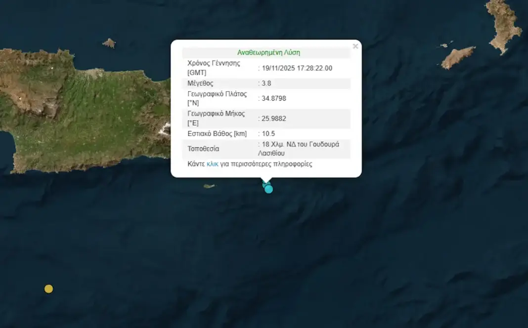 Νέος σεισμός σημειώθηκε στο Λασίθι, με μέγεθος 3,8 βαθμών της κλίμακας Ρίχτερ, λίγες ώρες μετά τη δόνηση των 3,7 που έγινε στις 4:14 το απόγευμα της Τετάρτης (19.11.2025).