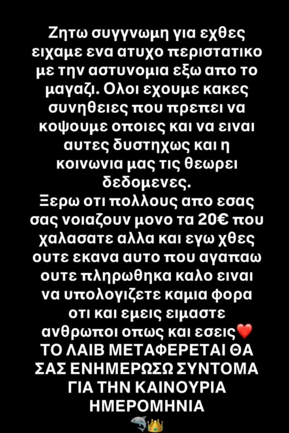 «Ζητώ συγγνώμη για εχθές (σ.σ. Παρασκευή), είχαμε ένα άτυχο περιστατικό με την αστυνομία έξω από το μαγαζί. Όλοι έχουμε κακές συνήθειες που πρέπει να κόψουμε, όποιες και να είναι αυτές. Δυστυχώς και η κοινωνία μας τις θεωρεί δεδομένες. Ξέρω ότι πολλούς από εσάς σας νοιάζουν μόνο τα 20 ευρώ που χαλάσατε, αλλά και εγώ ούτε έκανα αυτό που αγαπάω, ούτε πληρώθηκα. Καλό είναι να υπολογίζετε καμιά φορά ότι είμαστε άνθρωποι όπως εσείς».