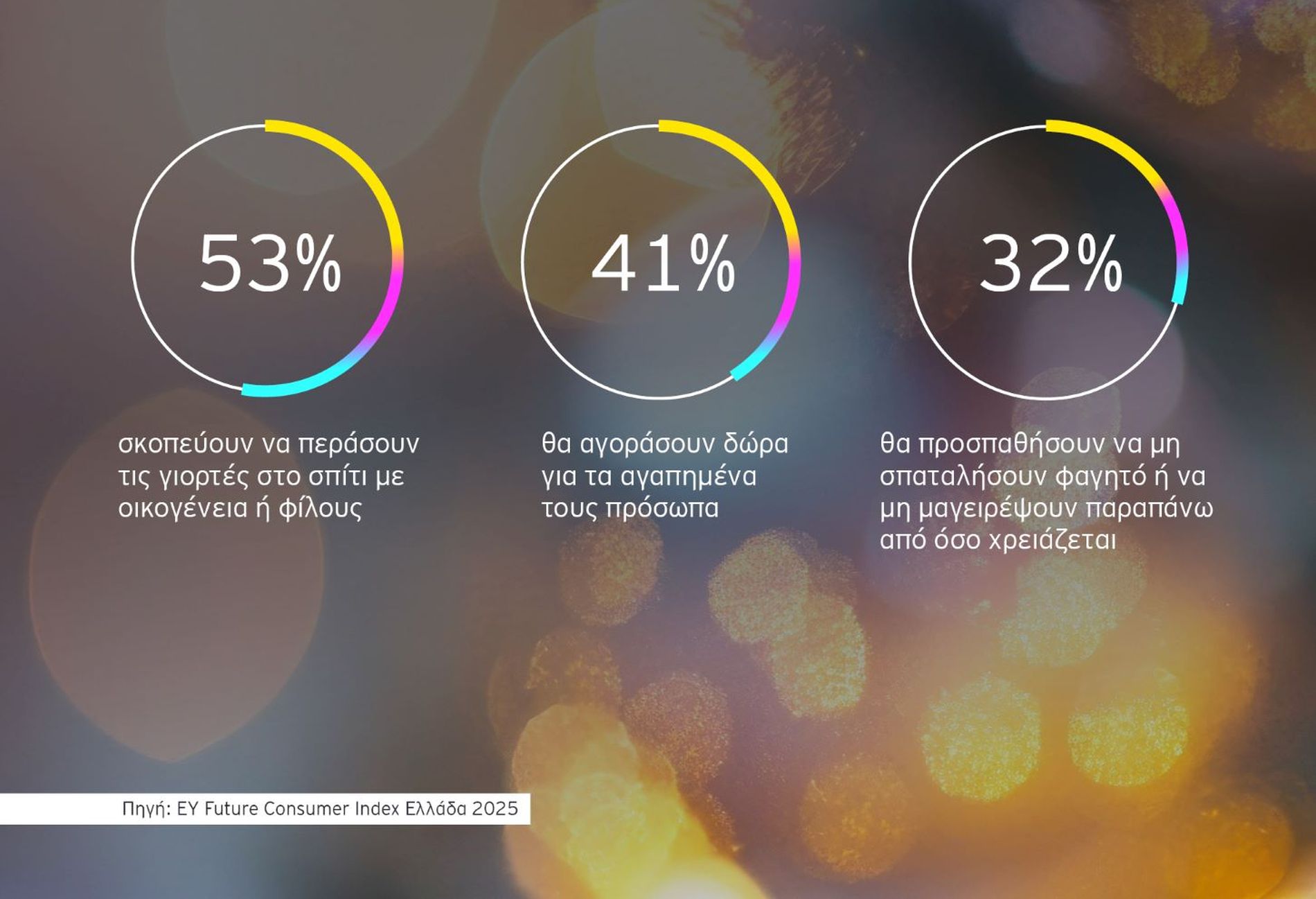 Η νέα μεγάλη έρευνα της EY Ελλάδος αποκαλύπτει πως, παρά μια μικρή ανάκαμψη στη διάθεση για αγορές, η πραγματικότητα παραμένει σκληρή, αφού οι περισσότεροι καταναλωτές μετρούν προσεκτικά κάθε ευρώ, περιορίζονται στα βασικά και επιλέγουν να γιορτάσουν στο σπίτι, αναζητώντας τρόπους να κρατήσουν το κόστος χαμηλά. Τα ευρήματα δείχνουν με καθαρό τρόπο πόσο διαφορετικές –και πιο δύσκολες– έχουν γίνει πλέον οι γιορτές για τα ελληνικά νοικοκυριά.