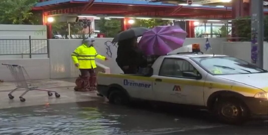 Στο Μοσχάτο, έξω από τον σταθμό του ΗΣΑΠ, άνθρωποι του Δήμου υποχρεώθηκαν να επιστρατεύσουν μέχρι και αγροτικό όχημα, προκειμένου να μεταφέρουν πολίτες μέσα σε καρότσες για να περάσουν τον πλημμυρισμένο δρόμο.