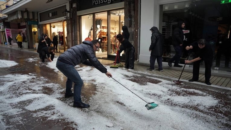 Το έντονο χαλάζι στην οδό Ερμού στο κέντρο έφραξε τα φρεάτια, με αποτέλεσμα τα νερά να συσσωρευτούν και μέσα σε λίγα λεπτά να πλημμυρίσουν αρκετά καταστήματα.