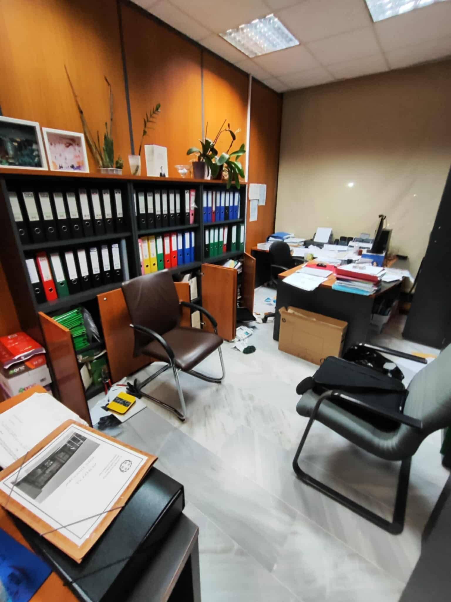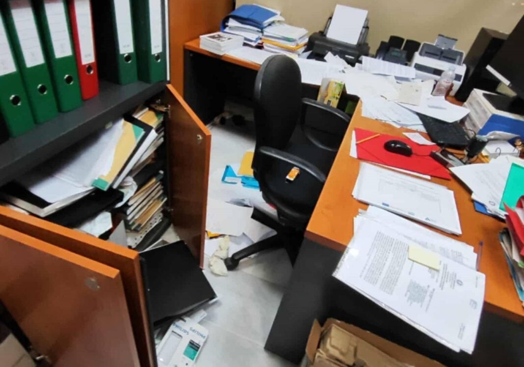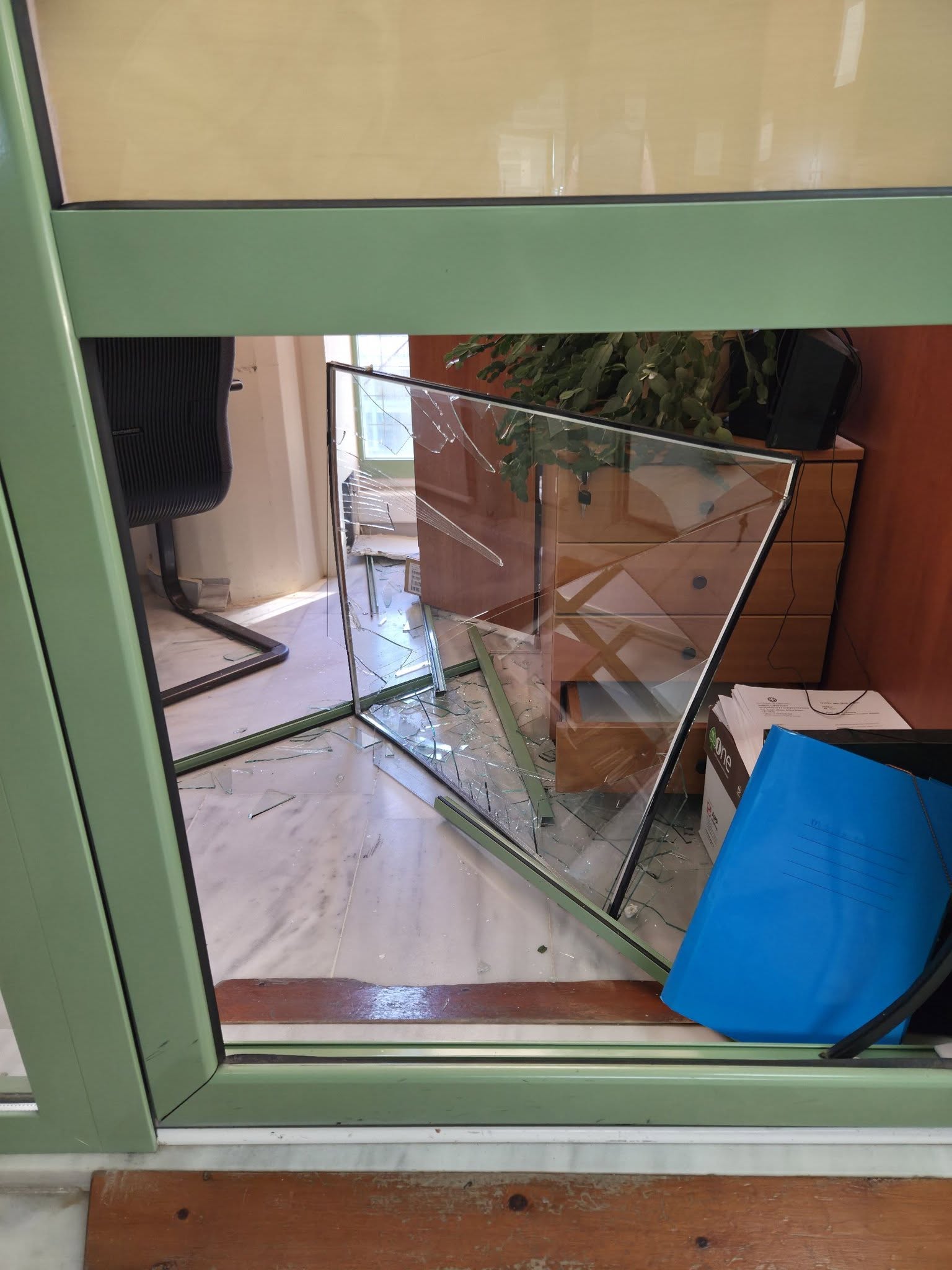 Ο κ. Παπασταύρου, δημοσίευσε φωτογραφίες στις οποίες φαίνεται ότι οι διαρρήκτες έσπασαν τζαμαρία και εισέβαλαν στα γραφεία.