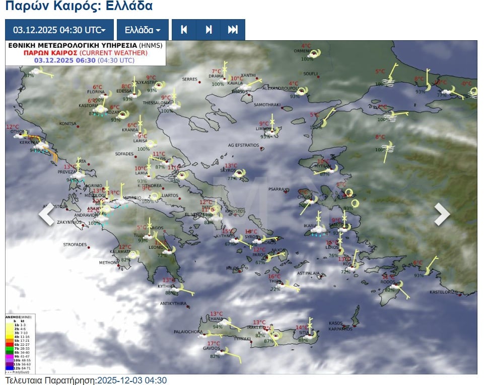 Σύμφωνα με την Εθνική Μετεωρολογική Υπηρεσία, σήμερα Τετάρτη 3 Δεκεμβρίου αναμένονται πιθανώς ισχυρές βροχές και καταιγίδες στα νησιά του Ιονίου και από το απόγευμα στη νότια Πελοπόννησο και τη νότια Κρήτη.