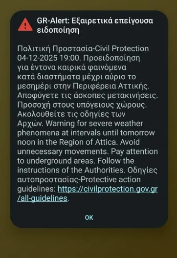 Προειδοποιητικό μήνυμα του 112 ήχησε στα κινητά των κατοίκων της Αττικής, προειδοποιώντας για τα καιρικά φαινόμενα έως αύριο το μεσημέρι.