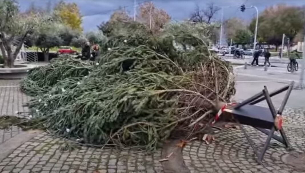 Ισχυροί άνεμοι που συνοδεύουν την κακοκαιρία Byron προκάλεσαν το πρωί την κατάρρευση του χριστουγεννιάτικου δέντρου που είχε στηθεί μπροστά από το δημαρχείο Θεσσαλονίκης.
