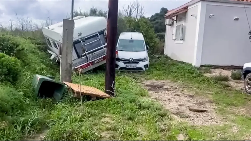 Σύμφωνα με ρεπορτάζ του ERTNews, ένα τροχόσπιτο παρασύρθηκε από τη δύναμη του ποταμού και κατάληξε πάνω στο αυτοκίνητο των Γερμανών.