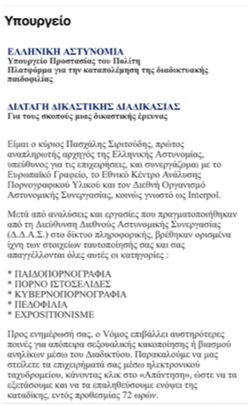 Συγκεκριμένα, οι δράστες χρησιμοποιώντας τα στοιχεία αυτά σε επιστολή δήθεν αρμόδιων ελεγκτικών Αρχών, προσπαθούν να εξαπατήσουν πολίτες – χρήστες του διαδικτύου, με το πρόσχημα ότι ο αποδέκτης τους εμπλέκεται σε υπόθεση παιδικής πορνογραφίας και άλλων αδικημάτων.