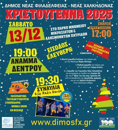 Για το επόμενο Σάββατο έχει προγραμματιστεί να γίνει το άναμμα του χριστουγεννιάτικου δένδρου στο δήμο Νέας Φιλαδέλφειας – Νέας Χαλκηδόνας το οποίο θα πραγματοποιηθεί το Σάββατο 13 Δεκεμβρίου στο Μνημείο Μικρασιατών.