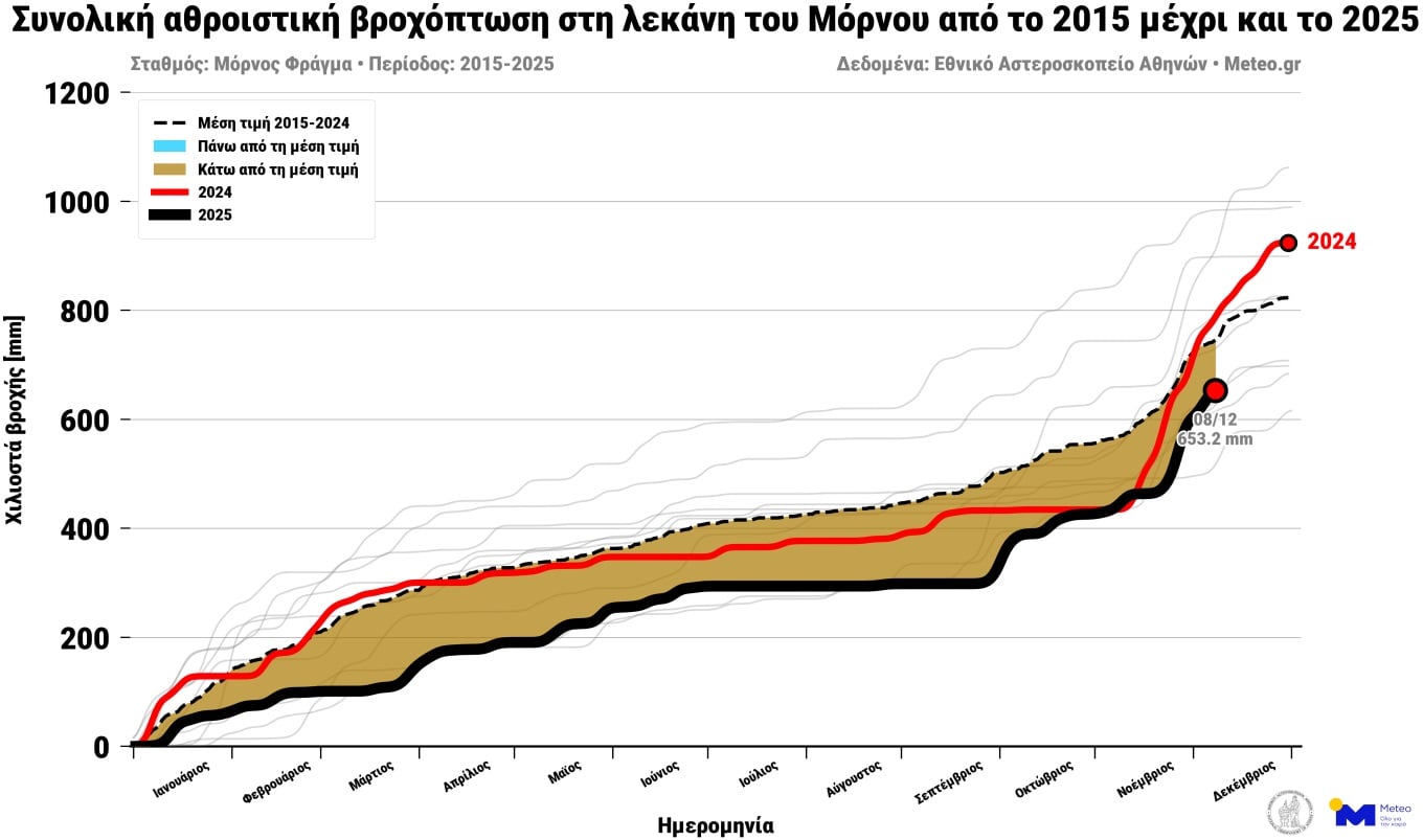Τα διαγράμματα που συνοδεύουν την ανάλυση του meteo.gr δείχνουν ότι η ετήσια βροχόπτωση έως τις 8 Δεκεμβρίου 2025 παραμένει σημαντικά κάτω από τη μέση τιμή της τελευταίας δεκαετίας.