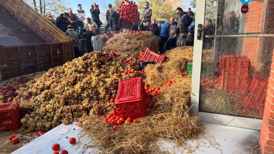 Οι συγκεντρωμένοι σε ένδειξη διαμαρτυρίας έριξαν στο σημείο γάλα, άχυρα, ντομάτες και σταφύλια μπροστά από το κτίριο, θέλοντας να εκφράσουν την αγανάκτησή τους για τα προβλήματα που αντιμετωπίζει ο κλάδος τους.