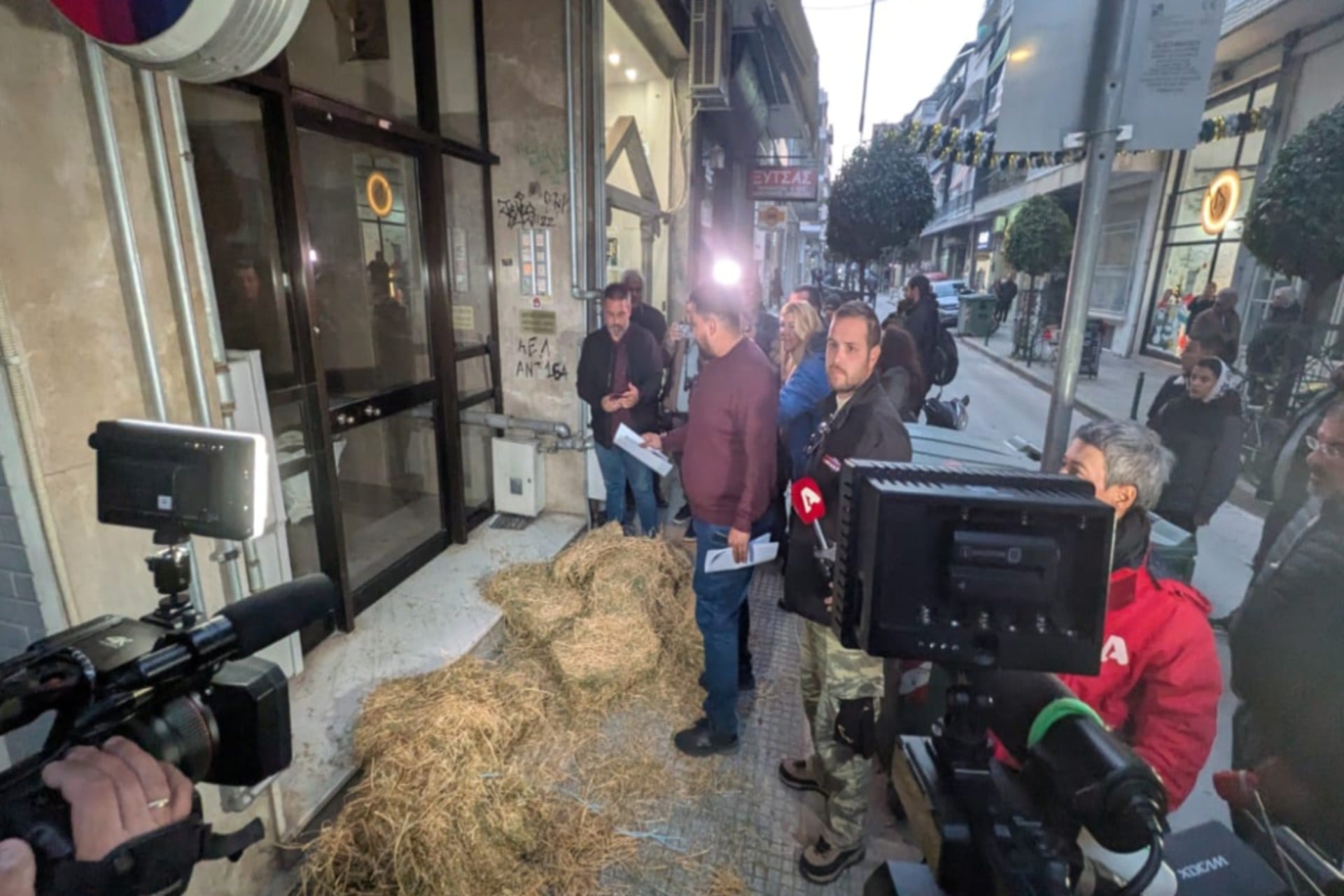 Οι ίδιοι έφτασαν σε συμβολική κίνηση διαμαρτυρίας, γέμισαν την είσοδο με σανό, με τον Ιορδάνη Ιωαννίδη, εκπρόσωπο της ενωτικής ομοσπονδίας αγροτικών συλλόγων Λάρισας, να δηλώνει μάλιστα ότι «εμείς δεν θα φάμε το σανό που μας δίνει η κυβέρνηση».