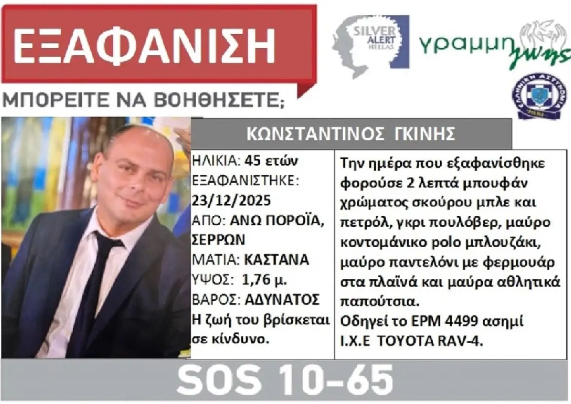 «Από την Τρίτη το πρωί στις 9:30 το πρωί που αγνοείται δεν έχουμε κανένα σημάδι», ανέφερε χαρακτηριστικά και πρόσθεσε: «Δεν πήρε μαζί του προσωπικά αντικείμενα, ούτε κινητό, ούτε πορτοφόλι. Όμως πήρε το αυτοκίνητο του. Πριν φύγει δεν είπε σε κανέναν τίποτα. Δεν γνωρίζει κανείς τίποτα, δεν είδε κανείς τίποτα. Δεν φαινόταν να τον απασχολεί κάτι».