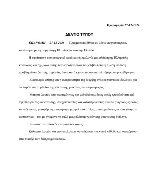 Όπως αναφέρουν, είναι πλέον αναγκαία η έναρξη ενός ουσιαστικού διαλόγου με την κυβέρνηση για το παρόν και το μέλλον της ελληνικής γεωργίας και κτηνοτροφίας.
