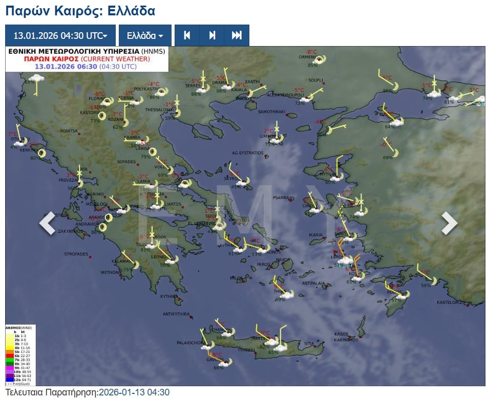 Θερμοκρασία: Από -04 (μείον 4) έως 08 βαθμούς Κελσίου. Στη δυτική Μακεδονία 3 με 5 βαθμούς χαμηλότερη.