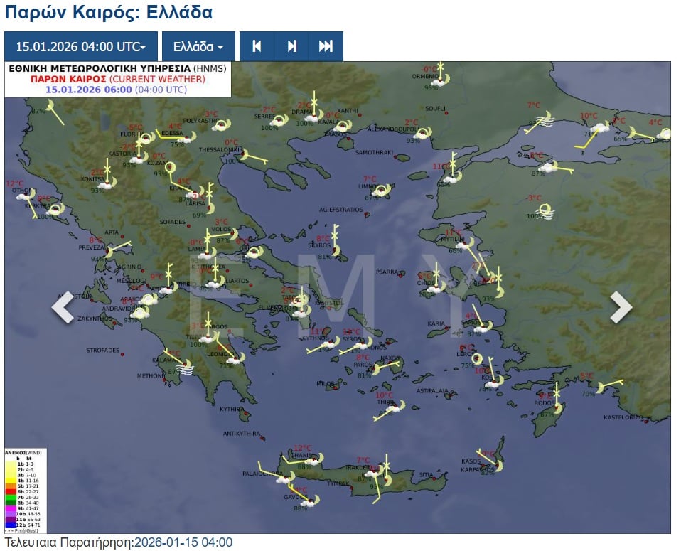 Θερμοκρασία: Από -01 (μείον 1) έως 14 βαθμούς Κελσίου. Στη δυτική Μακεδονία 2 με 3 βαθμούς χαμηλότερη.