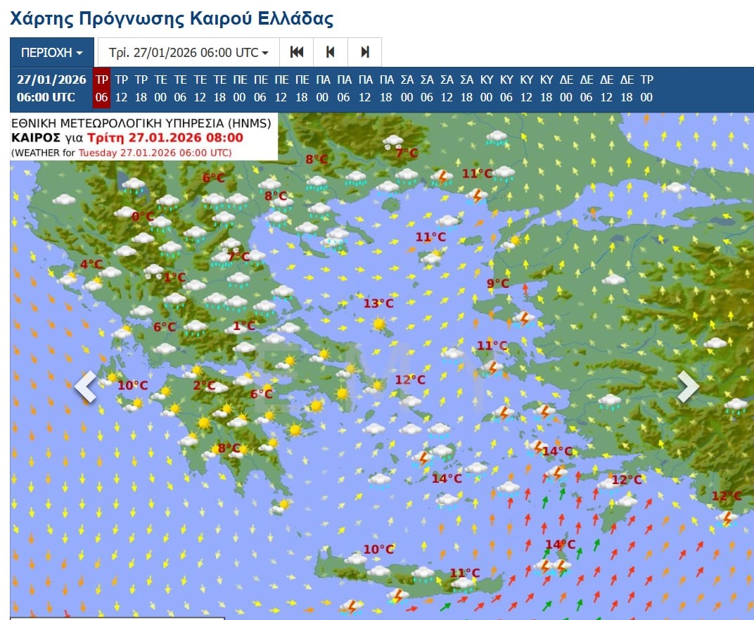 Ισχυρές βροχές, καταιγίδες και κατά τόπους χαλαζοπτώσεις συνθέτουν το σκηνικό του καιρού για σήμερα, Τρίτη, επηρεάζοντας κυρίως τα νησιά του Ανατολικού Αιγαίου, την Κρήτη και τα Δωδεκάνησα. Η κακοκαιρία συνοδεύεται από ενισχυμένους ανέμους και μικρή πτώση της θερμοκρασίας, ενώ σε ορεινές περιοχές της βόρειας Ελλάδας δεν αποκλείονται και ασθενείς χιονοπτώσεις. Οι πολίτες καλούνται να είναι προσεκτικοί, καθώς τα φαινόμενα κατά τόπους θα είναι έντονα, πριν παρουσιάσουν σταδιακή εξασθένηση και βελτίωση από αύριο.