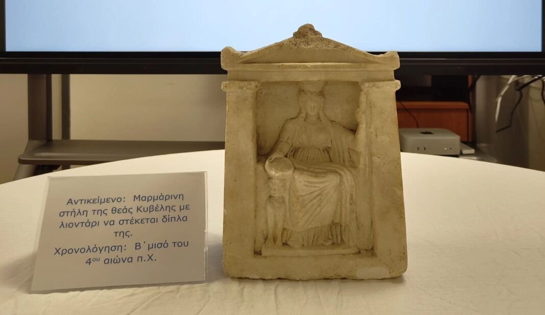 Στο πλαίσιο της έρευνας, εντοπίστηκε κρυμμένη σε πατάρι και κατασχέθηκε μια μαρμάρινη ναόσχημη αναθηματική στήλη (ένθρονη θεά Κυβέλη με ένα λιοντάρι δίπλα της), η οποία χρονολογείται στον 4ο π.Χ. αιώνα.