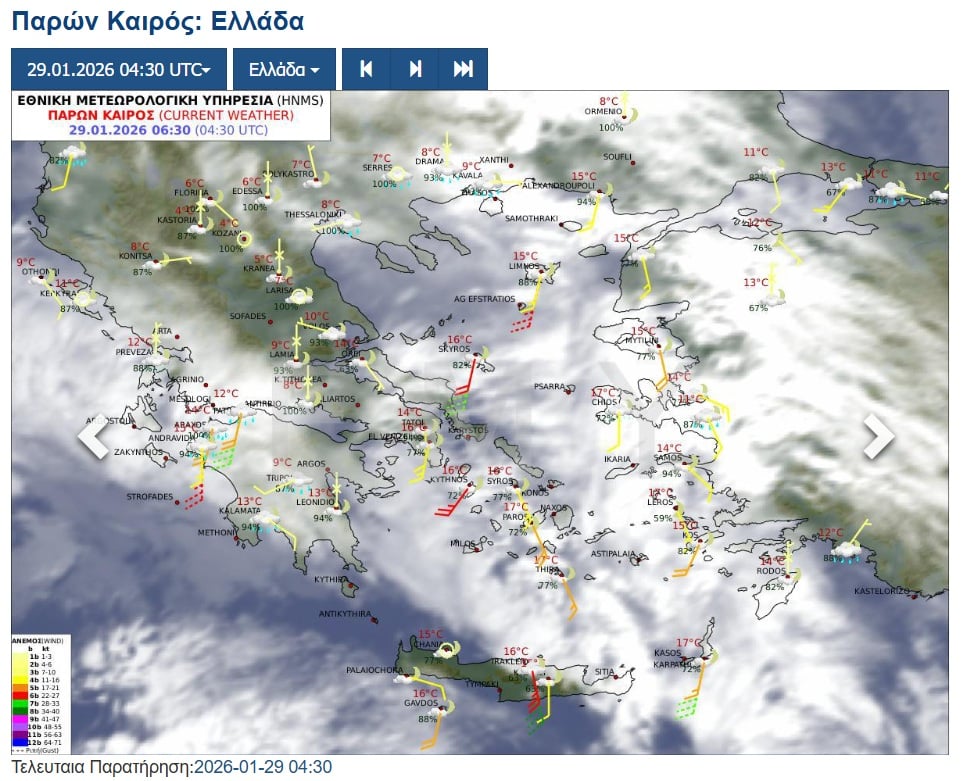 Σύμφωνα με το επικαιροποιημένο δελτίο επιδείνωσης του καιρού που εξέδωσε η Υπηρεσία, σήμερα, Πέμπτη 29 Ιανουαρίου, αναμένεται πρόσκαιρη επιδείνωση, με ισχυρές βροχές, καταιγίδες και πιθανώς κατά τόπους χαλαζοπτώσεις, κυρίως στη δυτική Ελλάδα και την ανατολική νησιωτική χώρα.