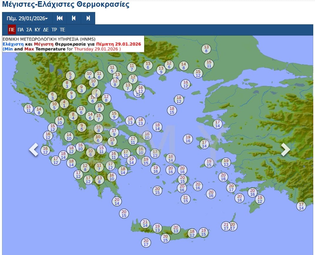 Θερμοκρασία: Από 12 έως 19 και τοπικά στην Κρήτη τους 20 βαθμούς Κελσίου.