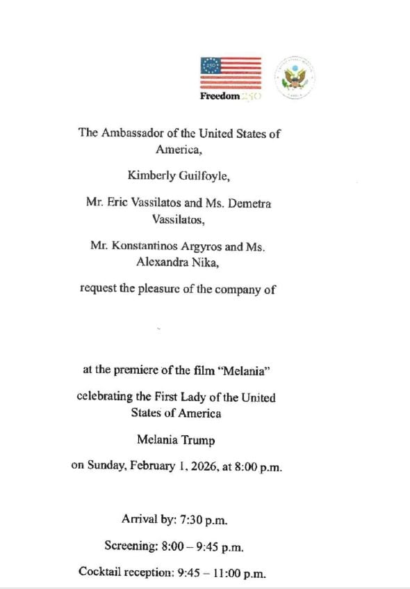Η πρόσκληση για την πρεμιέρα της ταινίας “Melania”, που φέρει τη σφραγίδα της Πρέσβεως των ΗΠΑ, Κίμπερλι Γκιλφόιλ προκαλεί όντως εντύπωση καθώς το ύφος της δεν συναντάται σε διπλωματικό επίπεδο.