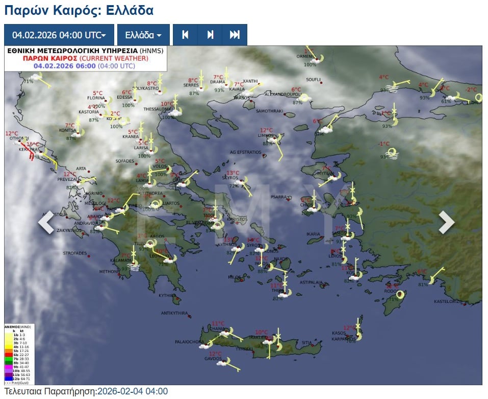 Πιο αναλυτικά, σήμερα, Τετάρτη 4 Φεβρουαρίου, αναμένονται νεφώσεις με τοπικές βροχές που το βράδυ στα δυτικά θα ενταθούν και στα νησιά του Ιονίου θα εκδηλωθούν και σποραδικές καταιγίδες. Ασθενείς χιονοπτώσεις θα σημειωθούν στα βορειοδυτικά ηπειρωτικά ορεινά από το βράδυ. Η ορατότητα τις πρωινές ώρες στα ηπειρωτικά θα είναι τοπικά περιορισμένη και πιθανώς να σχηματιστεί κατά τόπους ομίχλη.
