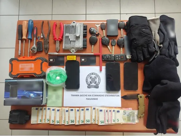 Πλήθος κλειδιών οχημάτων, διαρρηκτικά εργαλεία (πένσες, κατσαβίδια), κουκούλα full-face, περιλαίμια και γάντια.