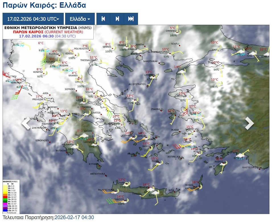β. στην Κρήτη, τις Κυκλάδες και τη νοτιοανατολική Πελοπόννησο την Τρίτη από τις πρωινές ώρες νοτιοδυτικοί 7 με 8 μποφόρ και από το βράδυ έως και τις πρωινές ώρες της Τετάρτης 18-02-2026 δυτικοί 9 μποφόρ».