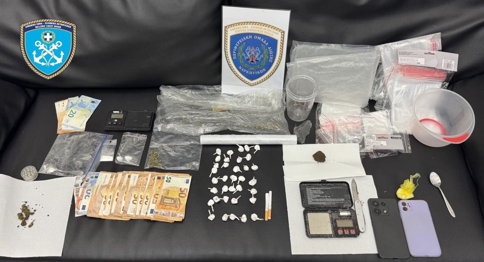 Στη συνέχεια, σε έρευνα που πραγματοποιήθηκε στο διαμέρισμά του στη Ραφήνα με τη βοήθεια του σκύλου «TOBY», κατασχέθηκαν: