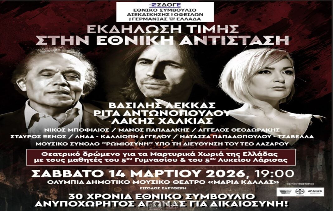 Με την ανιδιοτελή συμμετοχή σημαντικών καλλιτεχνών (Βασίλης Λέκκας, Ρίτα Αντωνοπούλου, Λάκης Χαλκιάς) καθώς και τους μαθητές του προγράμματος «Εκπαίδευση και Δημοκρατία» του 5ου Γυμνασίου και του 5ου Λυκείου της Λάρισας να τραγουδούν και να παρουσιάζουν ένα συγκλονιστικό θεατρικό δρώμενο για τα μαρτυρικά χωριά της Ελλάδας!