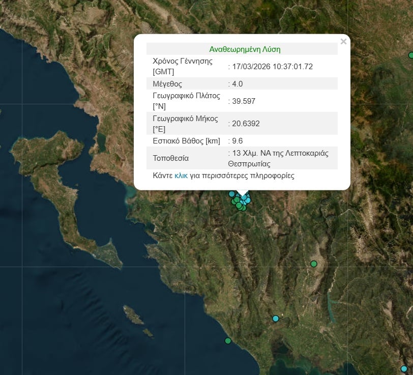 Ο σεισμός σημειώθηκε στις 12:37 το μεσημέρι, με το επίκεντρο να εντοπίζεται 11,9 χιλιόμετρα βόρεια-βορειοανατολικά της Αγίας Κυριακής Ιωαννίνων. Παράλληλα, σύμφωνα με τα αναθεωρημένα στοιχεία καταγραφής, η δόνηση εντοπίζεται και σε απόσταση περίπου 13 χιλιομέτρων νοτιοανατολικά της Λεπτοκαρυάς Θεσπρωτίας, γεγονός που αποτυπώνει τη γεωγραφική έκταση της σεισμικής δραστηριότητας στην περιοχή.