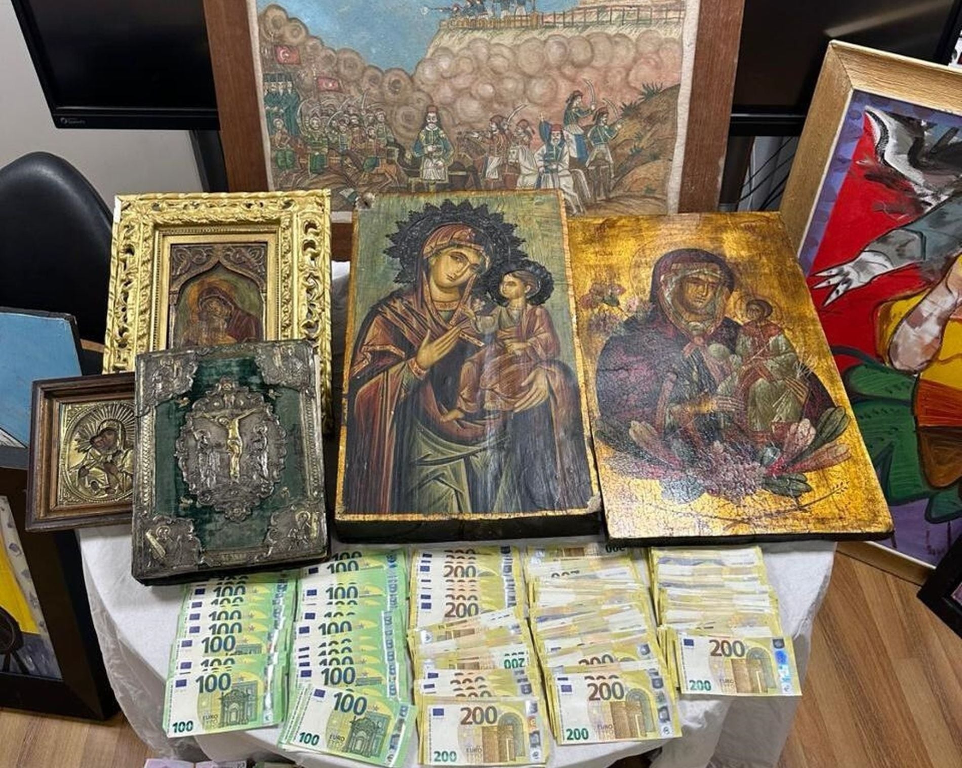 Στις αποθήκες της επιχείρησης βρέθηκαν επίσης περισσότερα από 300 έργα ζωγραφικής, τα οποία παρουσιάζουν ισχυρές ενδείξεις πλαστότητας. Σύμφωνα με τα αρχικά ευρήματα της έρευνας, μόνο επτά από αυτά έχουν κριθεί μέχρι στιγμής γνήσια, ενώ τα υπόλοιπα εξετάζονται εξονυχιστικά από ειδικούς πραγματογνώμονες.