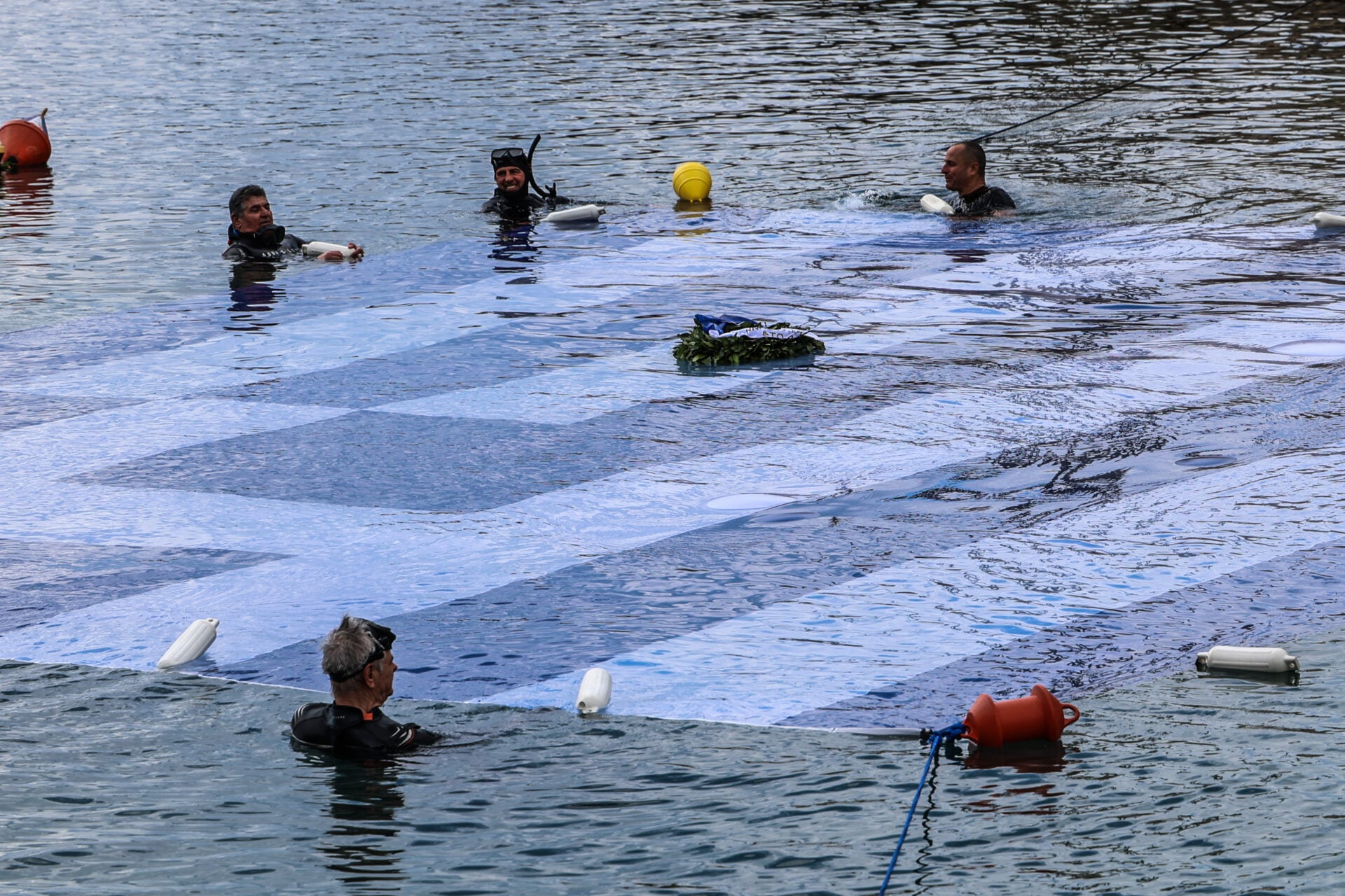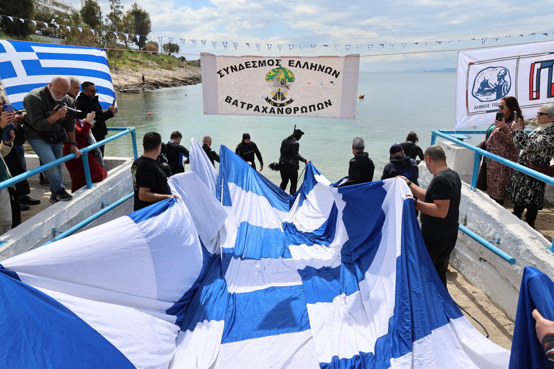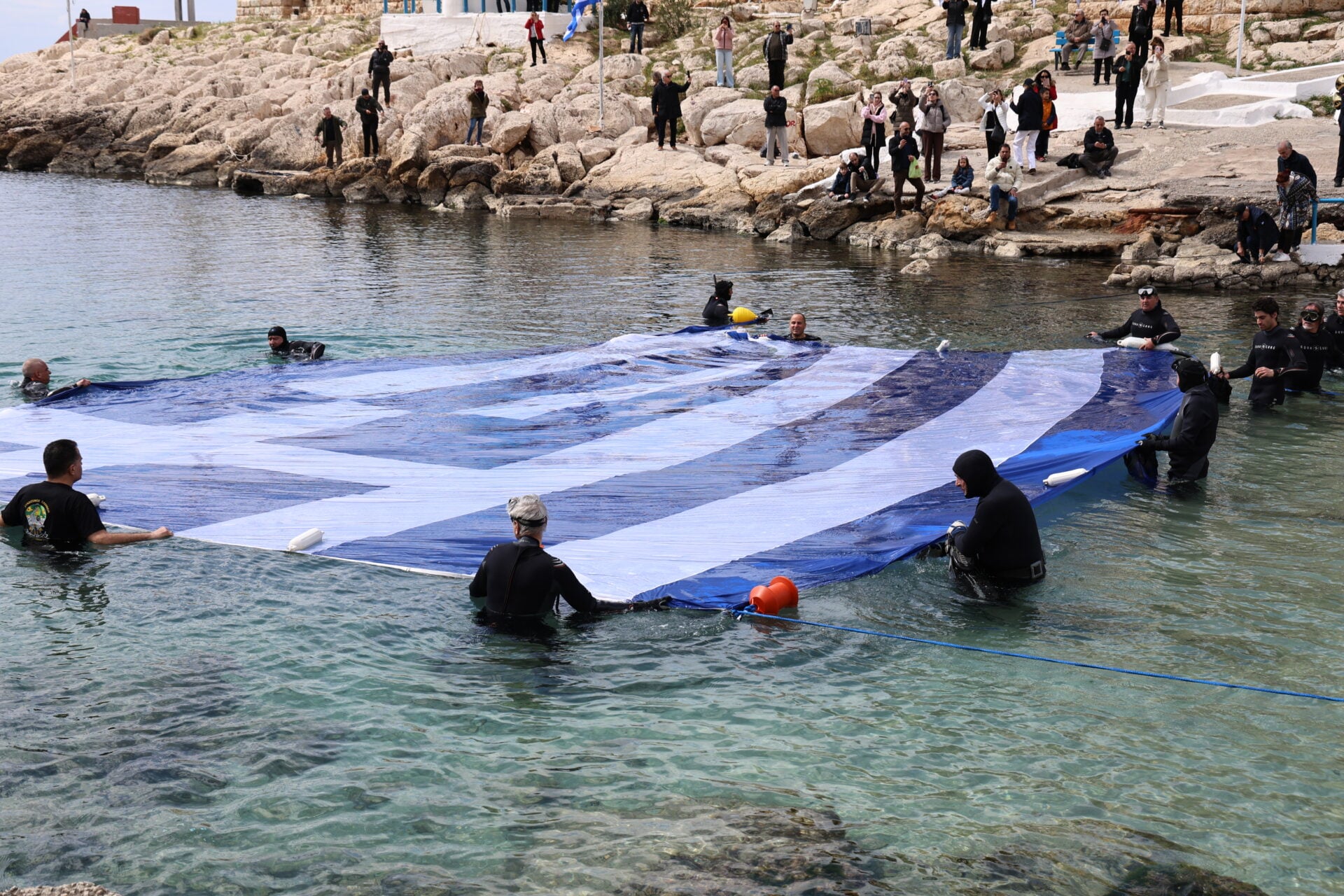 Στις 12:00 ακριβώς, στον Όρμο της Αφροδίτης (το γνωστό «Μπαϊκούτσι»), μέλη του Συνδέσμου Ελλήνων Βατραχανθρώπων βούτηξαν στα νερά για να απλώσουν μια τεράστια ελληνική σημαία στην επιφάνεια της θάλασσας.