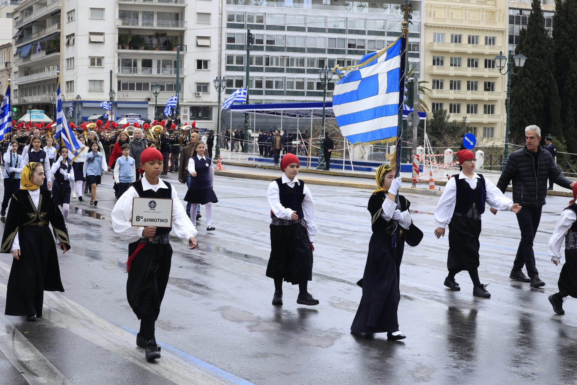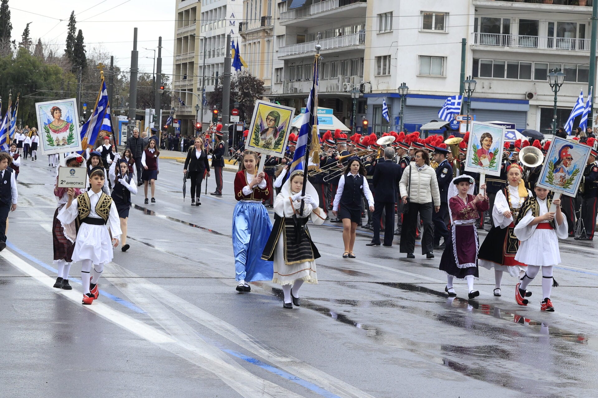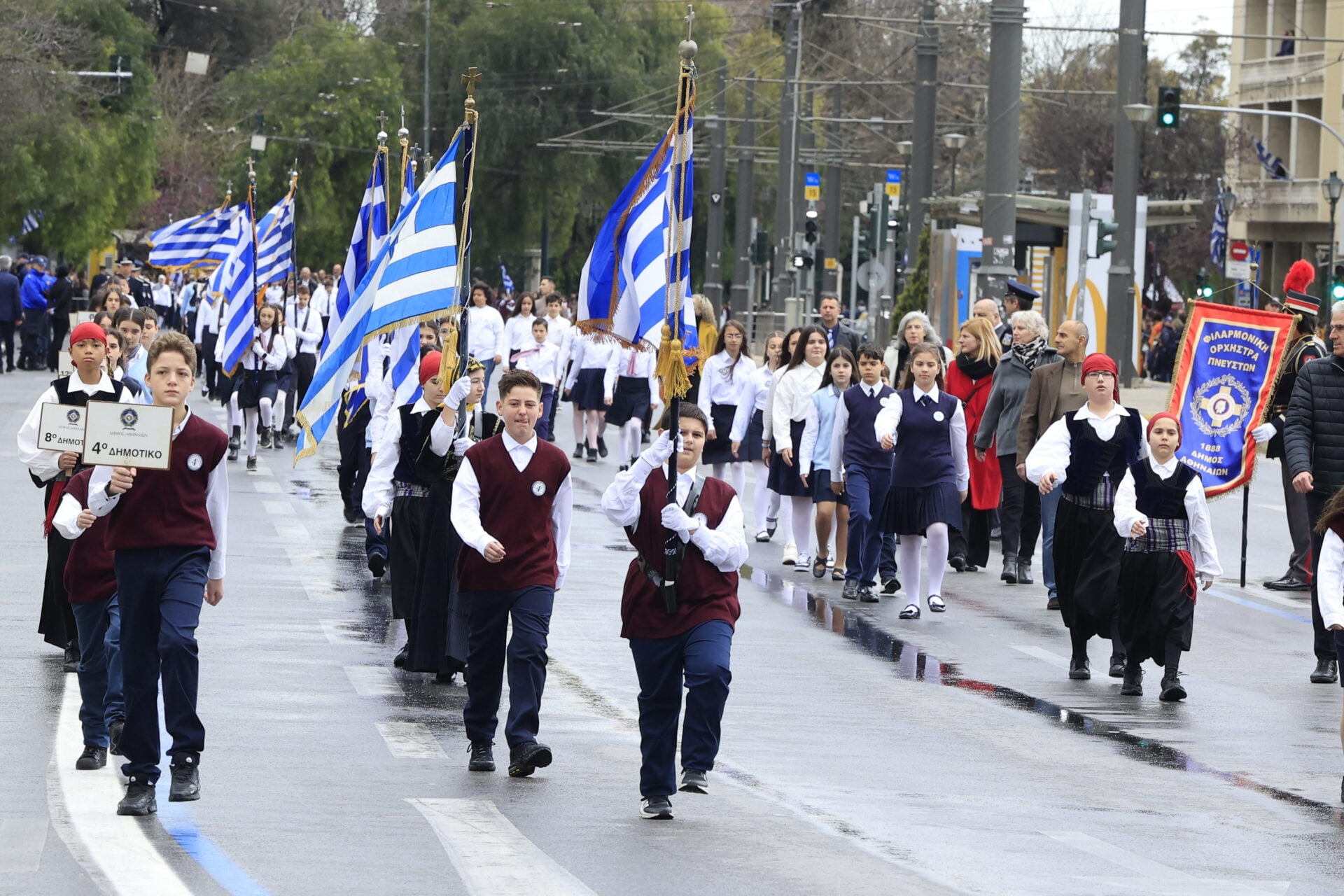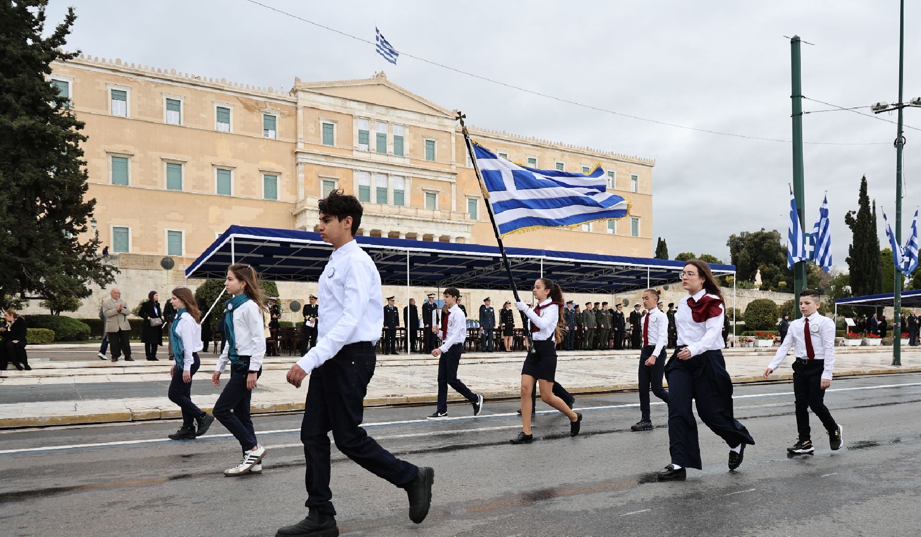 Υπό βροχερές συνθήκες πραγματοποιείται στο κέντρο της Αθήνας η μαθητική παρέλαση για την εθνική επέτειο της 25ης Μαρτίου, με τους μαθητές να παρελαύνουν κανονικά μπροστά από την εξέδρα των επισήμων στο Σύνταγμα.
