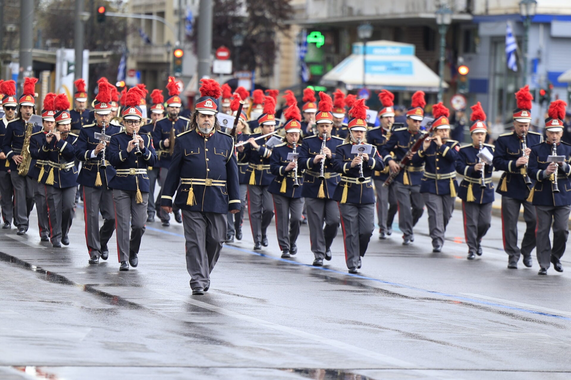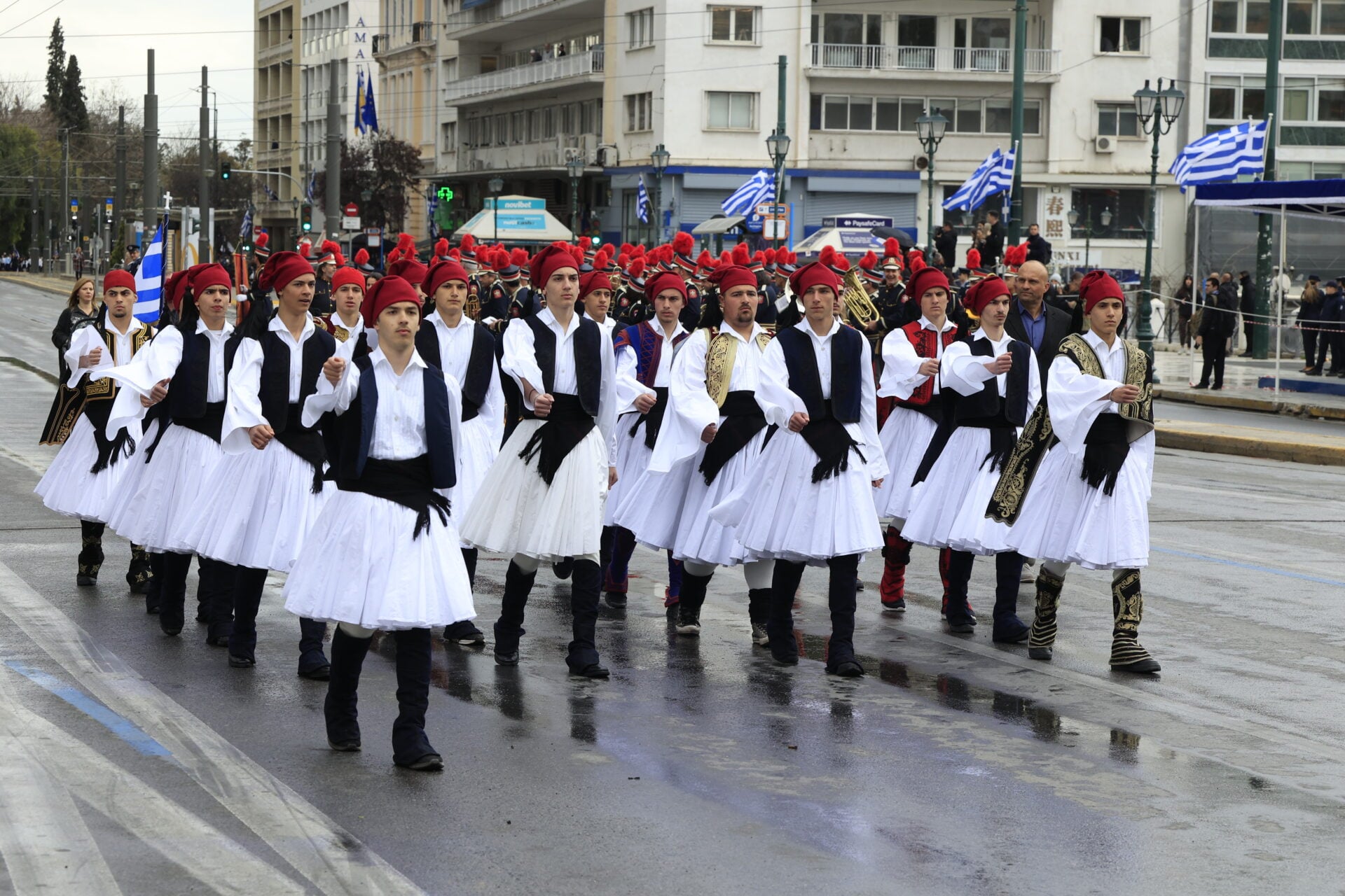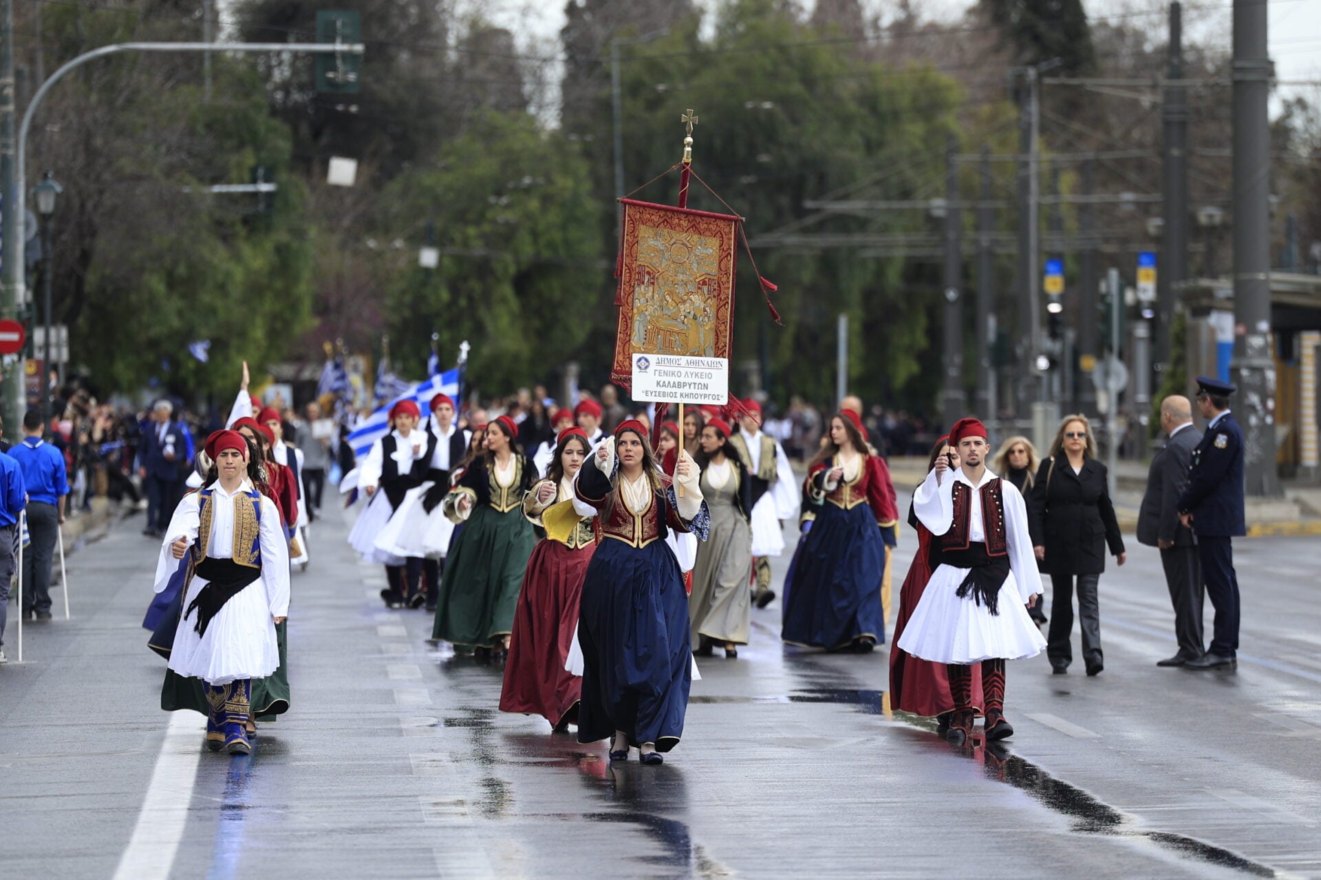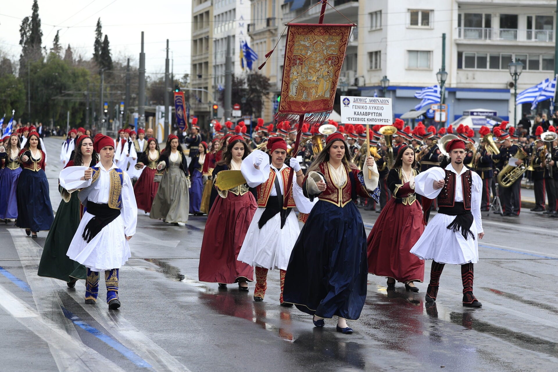 Υπό βροχερές συνθήκες πραγματοποιείται στο κέντρο της Αθήνας η μαθητική παρέλαση για την εθνική επέτειο της 25ης Μαρτίου, με τους μαθητές να παρελαύνουν κανονικά μπροστά από την εξέδρα των επισήμων στο Σύνταγμα.