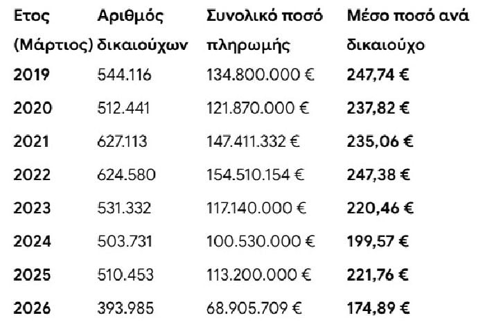 Από σήμερα το απόγευμα θα αρχίσουν να εμφανίζονται στους λογαριασμούς των δικαιούχων τα χρήματα που αντιστοιχούν στην 1η δόση του 2026 και αυτό που παρατηρεί κανείς είναι μία τεράστια μείωση: από τους 544.116 δικαιούχους και τα σχεδόν 135 εκατ. ευρώ του 2019, φτάσαμε σήμερα να καταβάλλονται μόλις 68,9 εκατομμύρια σε 393.985 δικαιούχους, τον χαμηλότερο αριθμό επί διακυβέρνησης Μητσοτάκη. Αντίστοιχα, το μέσο ποσό το 2019 ήταν 247 ευρώ και μειώθηκε σε 174 ευρώ φέτος!