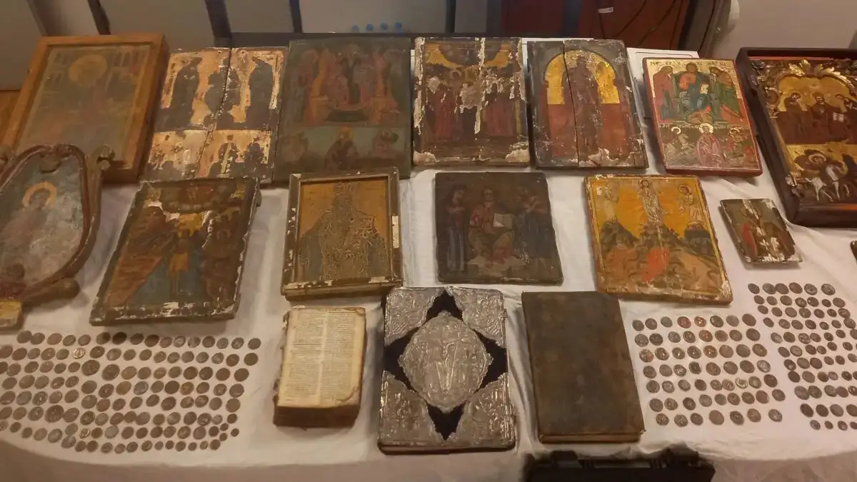 Η σοβαρότητα της υπόθεσης αποτυπώνεται στο εύρος των ευρημάτων που αποκάλυψαν οι αστυνομικές έρευνες στο πραγματικό «θησαυροφυλάκιο» του Μεγάλου Σπηλαίου. Οι αρχές κατέσχεσαν διακόσια εξήντα τέσσερα αρχαία νομίσματα, δεκατέσσερις βυζαντινές εικόνες, δύο Ιερά Ευαγγέλια και ένα εκκλησιαστικό βιβλίο του 18ου αιώνα, καθώς και τρία αρχιερατικά εγκόλπια. Παράλληλα, ο εντοπισμός επαγγελματικού ανιχνευτή μετάλλων, οπλισμού, φυσιγγίων και του ποσού των δώδεκα χιλιάδων οκτακοσίων δέκα ευρώ σε μετρητά, μαζί με ζυγαριές ακριβείας και φωτογραφικό υλικό αρχαιοτήτων, συμπληρώνουν την εικόνα μιας δομημένης δραστηριότητας που οδήγησε τους δύο μοναχούς πίσω στη φυλακή.