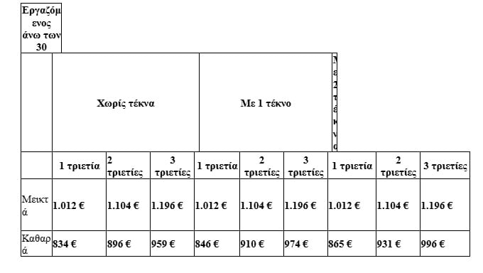 Ωστόσο, η επαναφορά των τριετών και τυχόν τέκνα ανεβάζουν σημαντικά τις καθαρές αποδοχές, ακόμη και για όσους είναι άνω των 30 ετών. Συγκεκριμένα: