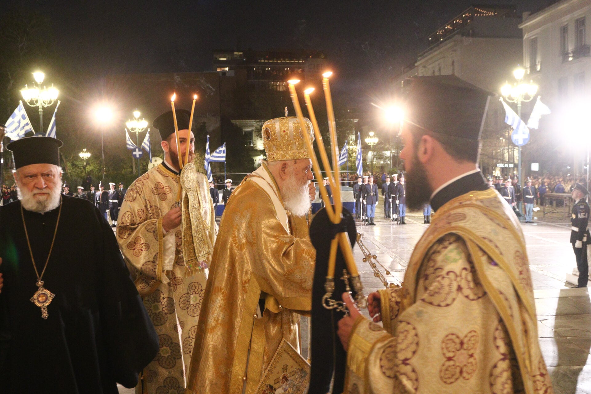 Η περιφορά του Επιταφίου ξεκίνησε από την οδό Μητροπόλεως, με τα στρατιωτικά αγήματα να αποδίδουν τιμές και τις φιλαρμονικές να συνοδεύουν την πομπή με πένθιμα εμβατήρια. Χιλιάδες πιστοί με αναμμένα κεριά στα χέρια ακολούθησαν το Σώμα του Κυρίου σε μια κατανυκτική διαδρομή που κατέληξε στην Πλατεία Συντάγματος. Εκεί, μπροστά από το Μνημείο του Αγνώστου Στρατιώτη, εκτυλίχθηκαν στιγμές εθνικής και θρησκευτικής ανάτασης, καθώς πάνω στην ειδικά στημένη εξέδρα ο Αρχιεπίσκοπος Ιερώνυμος τέλεσε δέηση υπέρ των πεσόντων του έθνους, στέλνοντας ένα μήνυμα ενότητας και ελπίδας κάτω από το φως της επερχόμενης Ανάστασης.