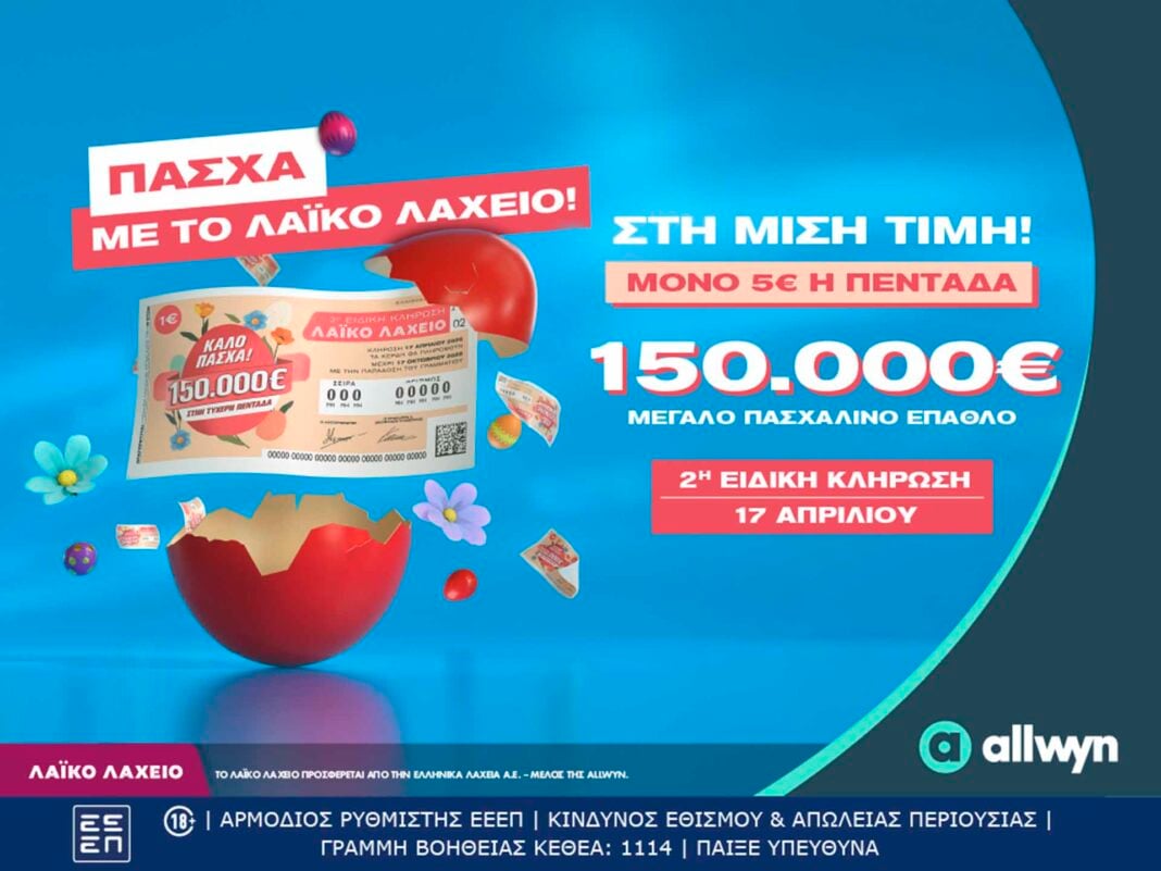 Το Λαϊκό Λαχείο παραμένει σε εορταστικό κλίμα και μοιράζει Πασχαλινό έπαθλο ύψους 150.000 ευρώ στην ειδική κλήρωση που θα πραγματοποιηθεί την Παρασκευή 17 Απριλίου.
