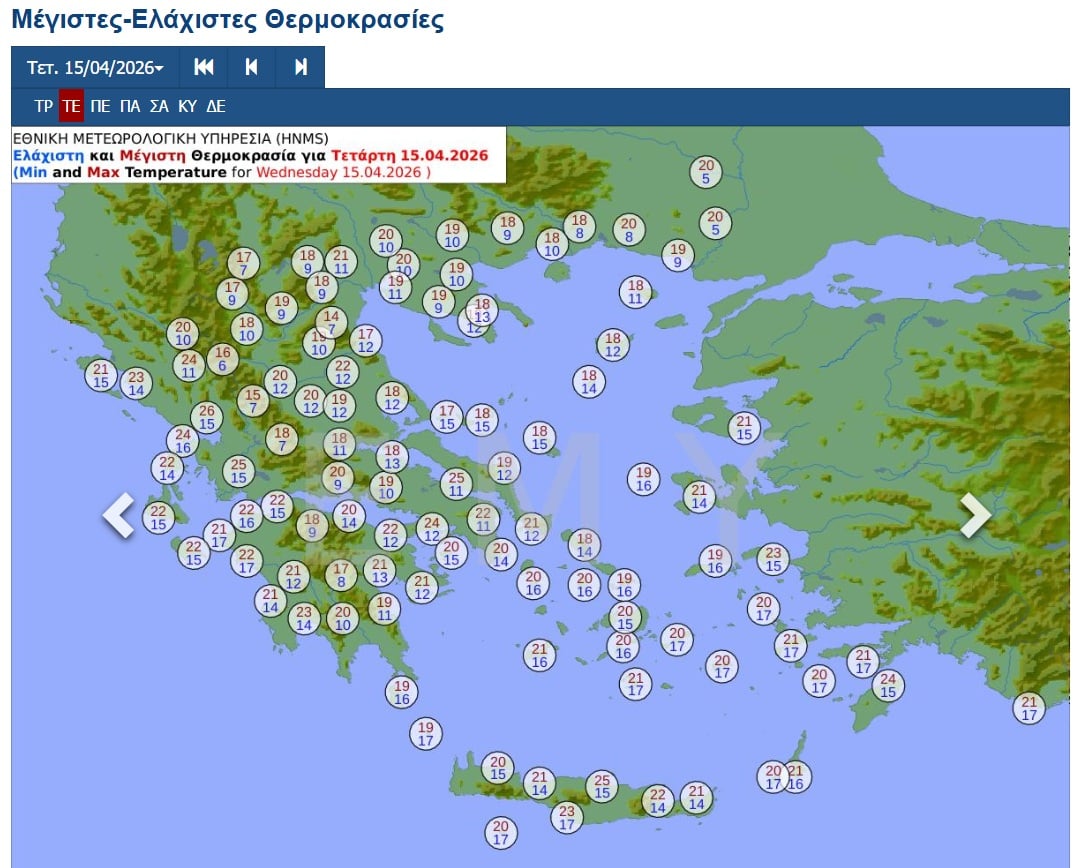 Θερμοκρασία: Από 12 έως 24 και τοπικά στα ηπειρωτικά έως 25 βαθμούς Κελσίου. Στο εσωτερικό της Ηπείρου 2 με 3 βαθμούς χαμηλότερη.