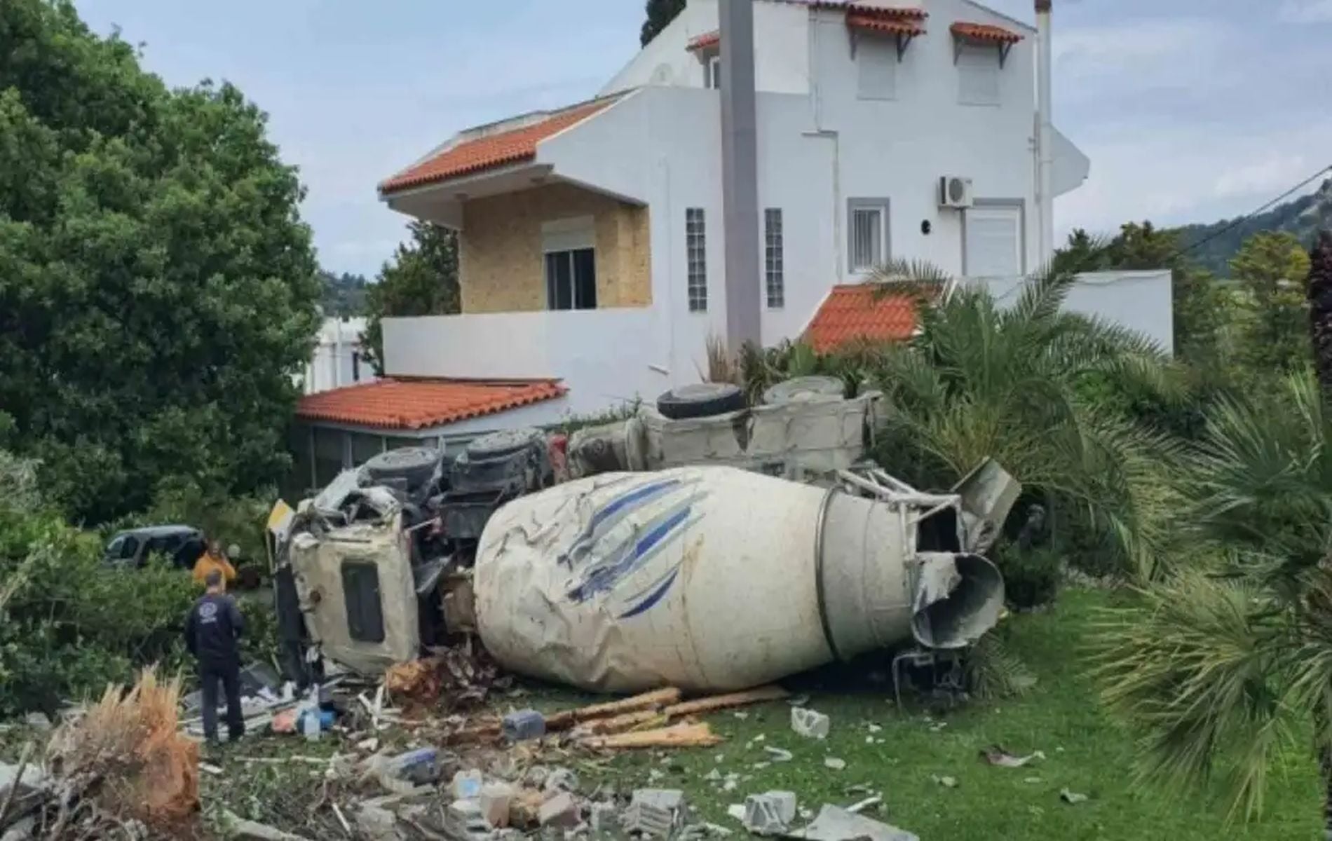 Το τροχαίο ατύχημα στην περιοχή Τρεις στη Ρόδο, όπου μια μπετονιέρα γεμάτη σκυρόδεμα αναποδογύρισε σε αυλή σπιτιού, αποτελεί ένα σοβαρό περιστατικό, αλλά ευτυχώς χωρίς ανθρώπινες απώλειες.