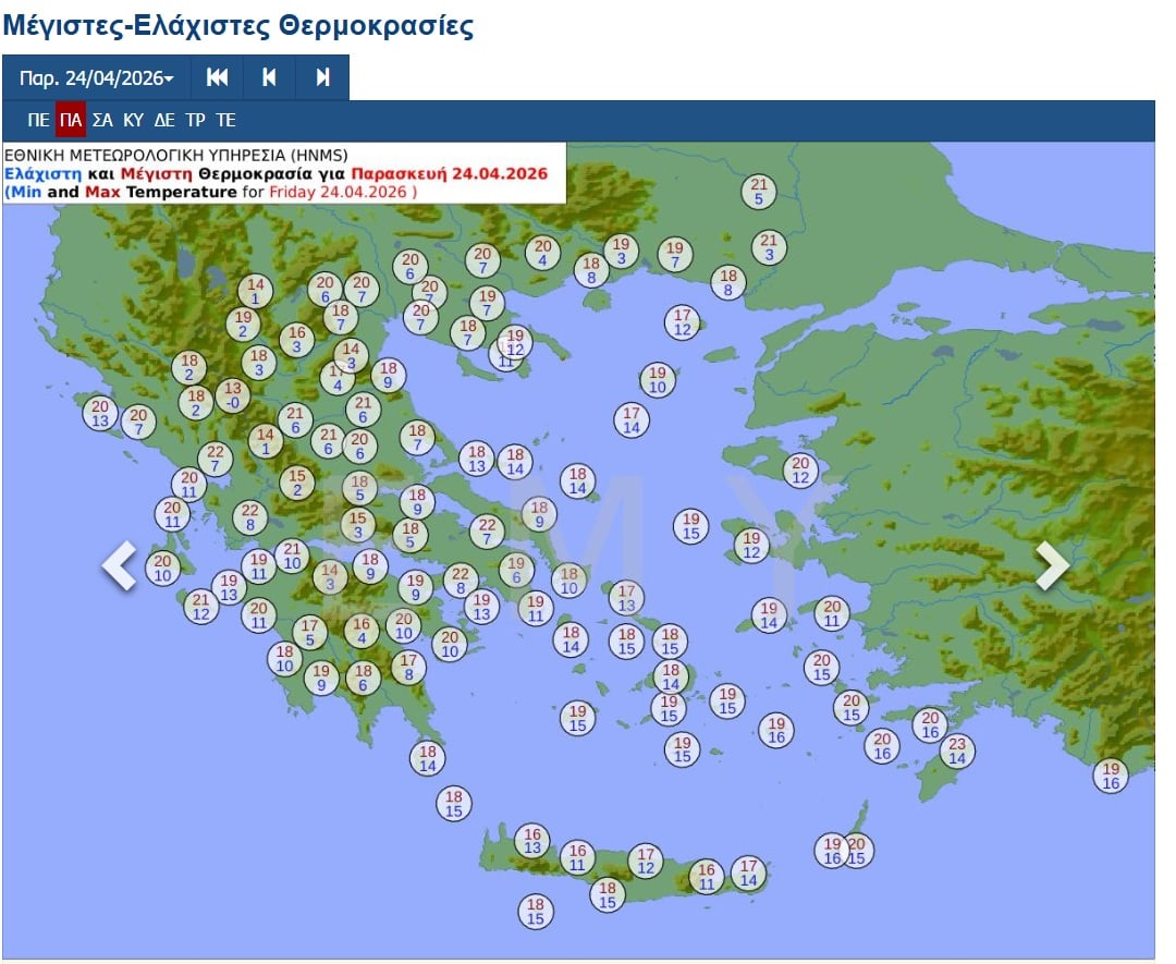 Θερμοκρασία: Από 07 έως 19 με 20 βαθμούς Κελσίου. Στη δυτική Μακεδονία η ελάχιστη 4 με 5 βαθμούς χαμηλότερη.