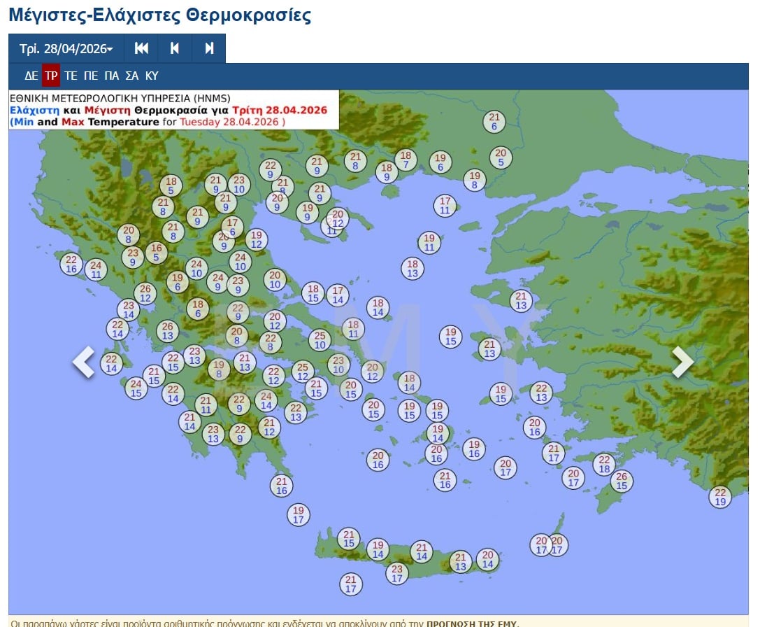 Θερμοκρασία: Από 10 έως 27 βαθμούς Κελσίου. Στη Θράκη η μέγιστη 2 με 3 βαθμούς χαμηλότερη.