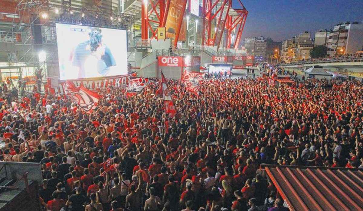 ➥ Οπαδοί του Ολυμπιακού, εν Πειραιεί, πανηγυρίζουν την κατάκτηση του πρωταθλήματος τηρώντας τις αποστάσεις των δύο χιλιοστών ανά χίλια άτομα.