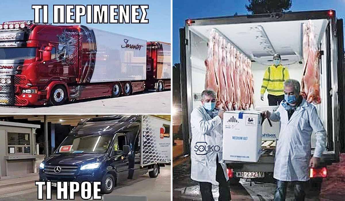 ➥ Το απίθανο κομπαρσιλίκι, τριτοκοσμικού στιλ, με το συνοδευόμενο από δυνάμεις ασφαλείας βανάκι, τους ταξιάρχους και τα κανάλια που υποδέχθηκαν, μαζί με τον Χαρδαλιά, δυο… χαρτόκουτες με εμβόλια ενέπνευσε τους δημιουργούς σατιρικών εικαστικών (memes) στο ίντερνετ. Απολαύστε μερικά εξ αυτών…